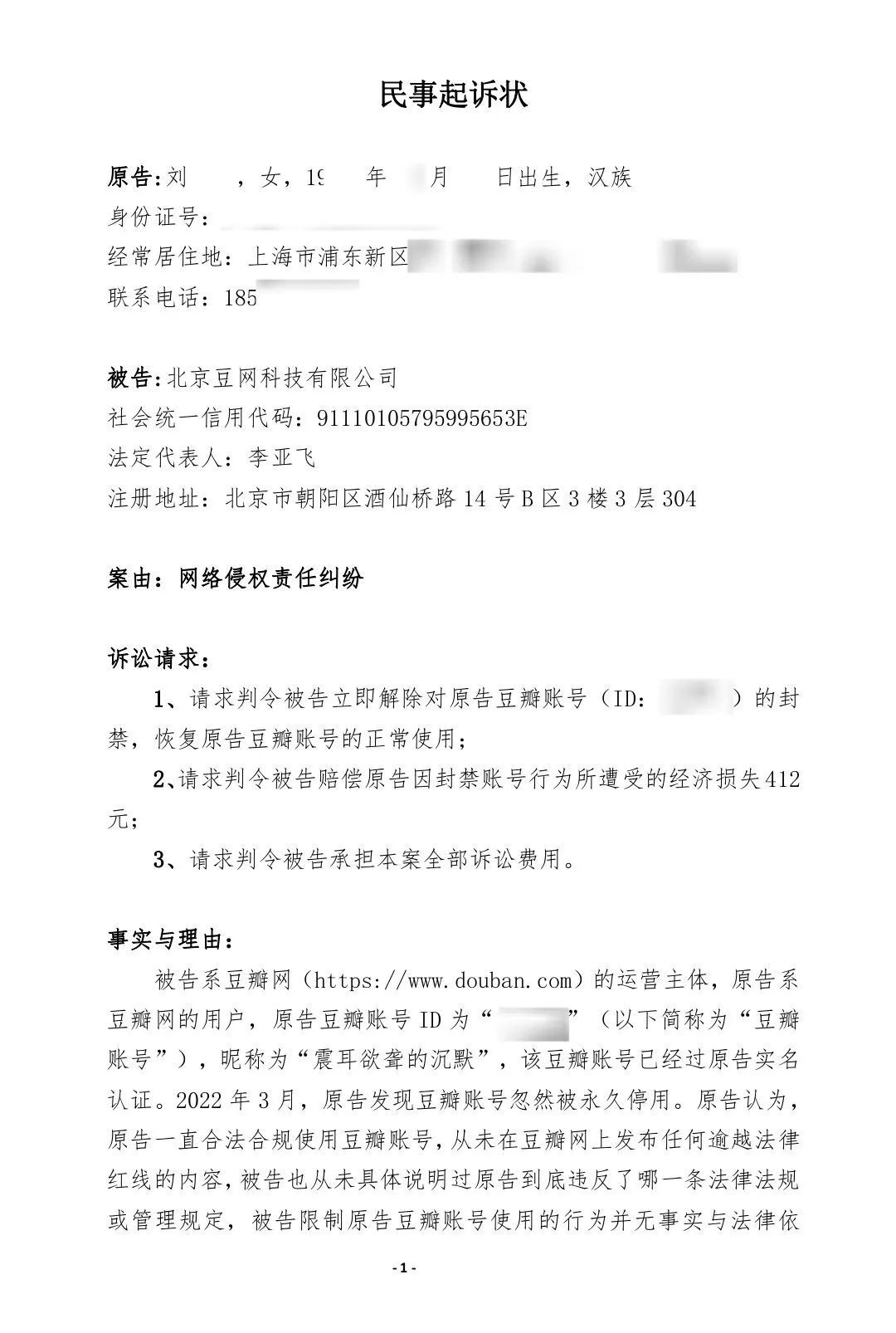 过去近9个月的时间里,我同时在帮几位被炸号的朋友起诉相应的社交平台(包括豆瓣和微博),主要的诉讼请求即为解封账号。其中,只有桔子起诉豆瓣的案子,侥幸立上了案并拿到了一审判决,而其他人,甚至至今都还没能立上案。