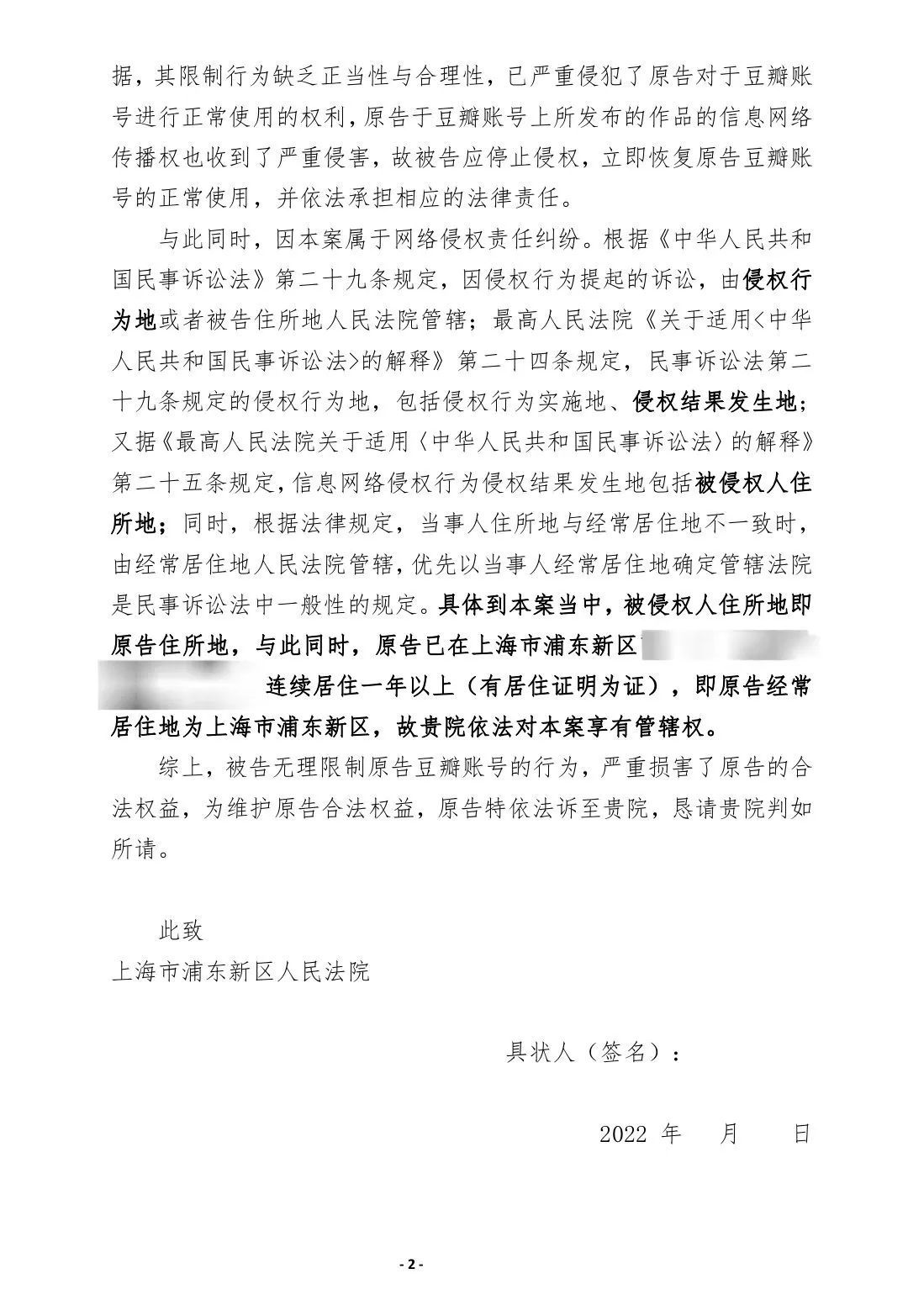 于是我们将案由从“网络服务合同纠纷”改为了“网络侵权责任纠纷”,然后我们便可以向桔子所在地的上海市浦东新区人民法院(以下简称为浦东法院)提起诉讼。