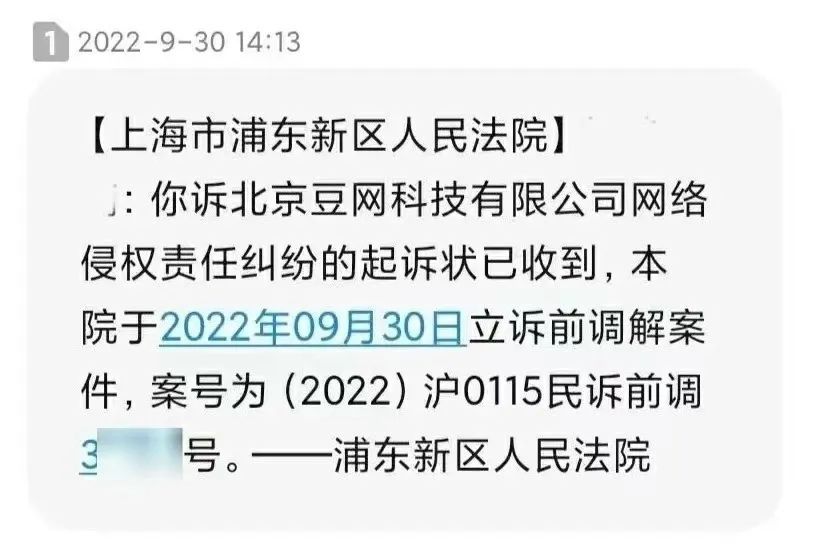 ▲浦东法院告知立案成功的短信