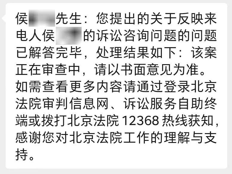 在我几位朋友向北互申请立案的过程当中,大家也都通过诉讼服务热线,以电话或留言的方式,催促过立案法官立案的进展,也询问过立案法官案件不予立案的原因。但都没能得到正面回应。