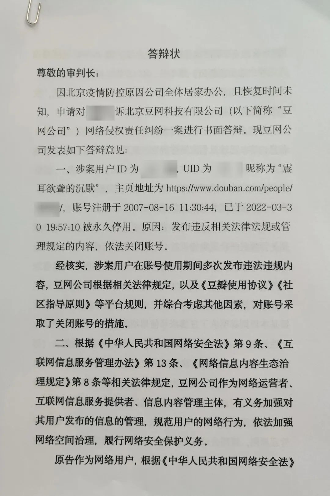 从答辩状可知,本案当中,豆瓣主要援引了《网络安全法》《互联网信息服务管理办法》《网络信息内容生态治理规定》等相关法律规定,以及《豆瓣使用协议》《社区指导原则》等平台规则,作为判定用户言论是否违规,以及作出封号决定的依据。