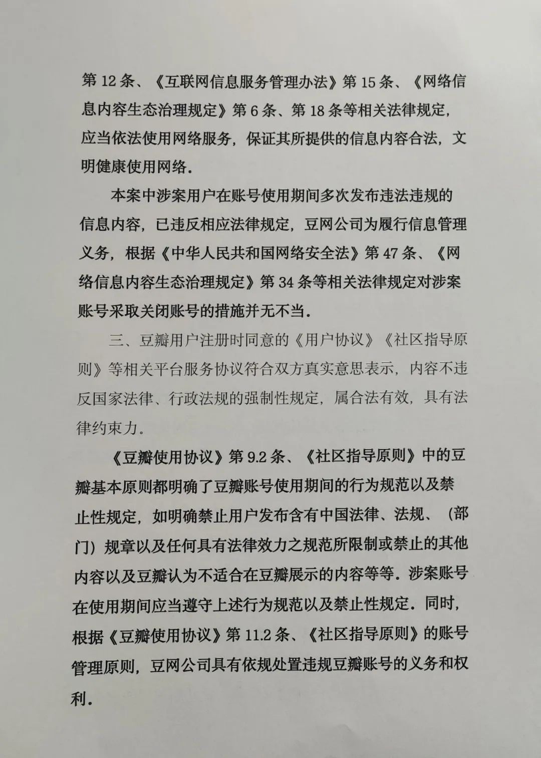 比如本案当中,豆瓣主要援引了《网络安全法》《互联网信息服务管理办法》《网络信息内容生态治理规定》等相关法律规定,以及《豆瓣使用协议》《社区指导原则》等平台规则,作为判定用户言论是否违规,以及做出封号决定的依据。同时,这些规定与规则,也为法官提供了判案的依据。