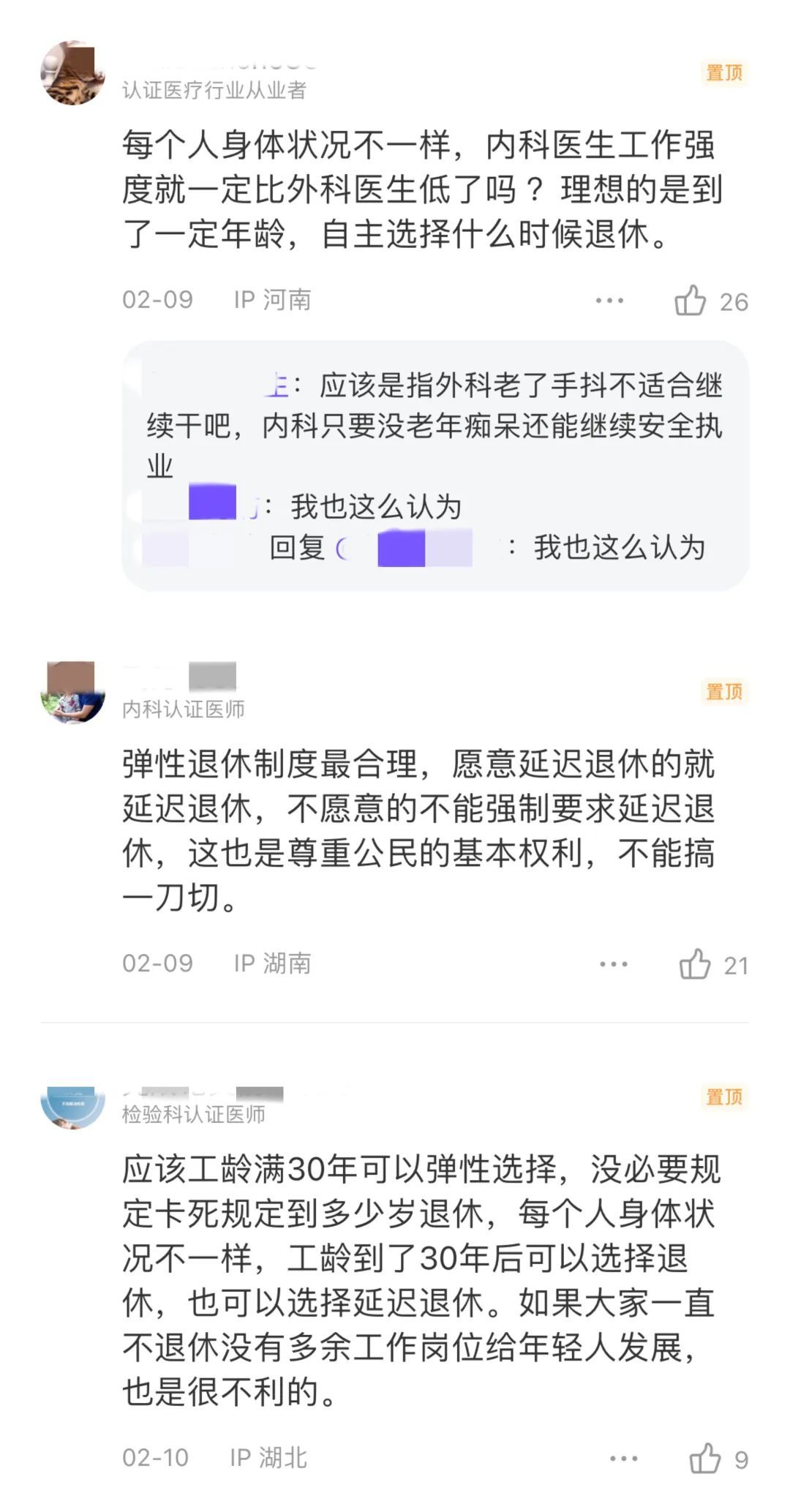 闫航认为既然医生之间有能力差异,那么根据每个人的意愿,或根据不同科室、不同工作量来制订不同的退休方案,不失为好的选择。从丁香园论坛医生们的讨论也可以看出,「弹性方案」在许多医生眼中会是一种理想方式。