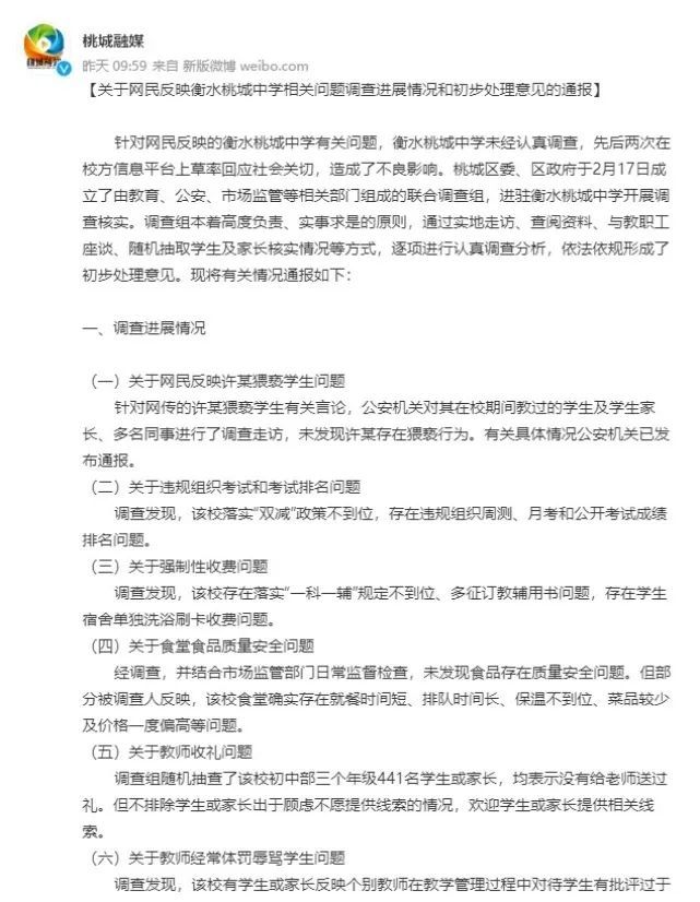 2022年2月关于桃城中学的官方通报,图源:桃城融媒官方微博
