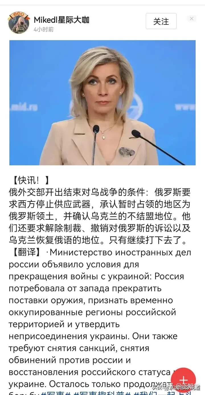 在东方大国诚心诚意对俄乌战争“劝和促谈”的背景下,不知俄罗斯从哪里找到了底气,竟然开出了如下谈判条件: