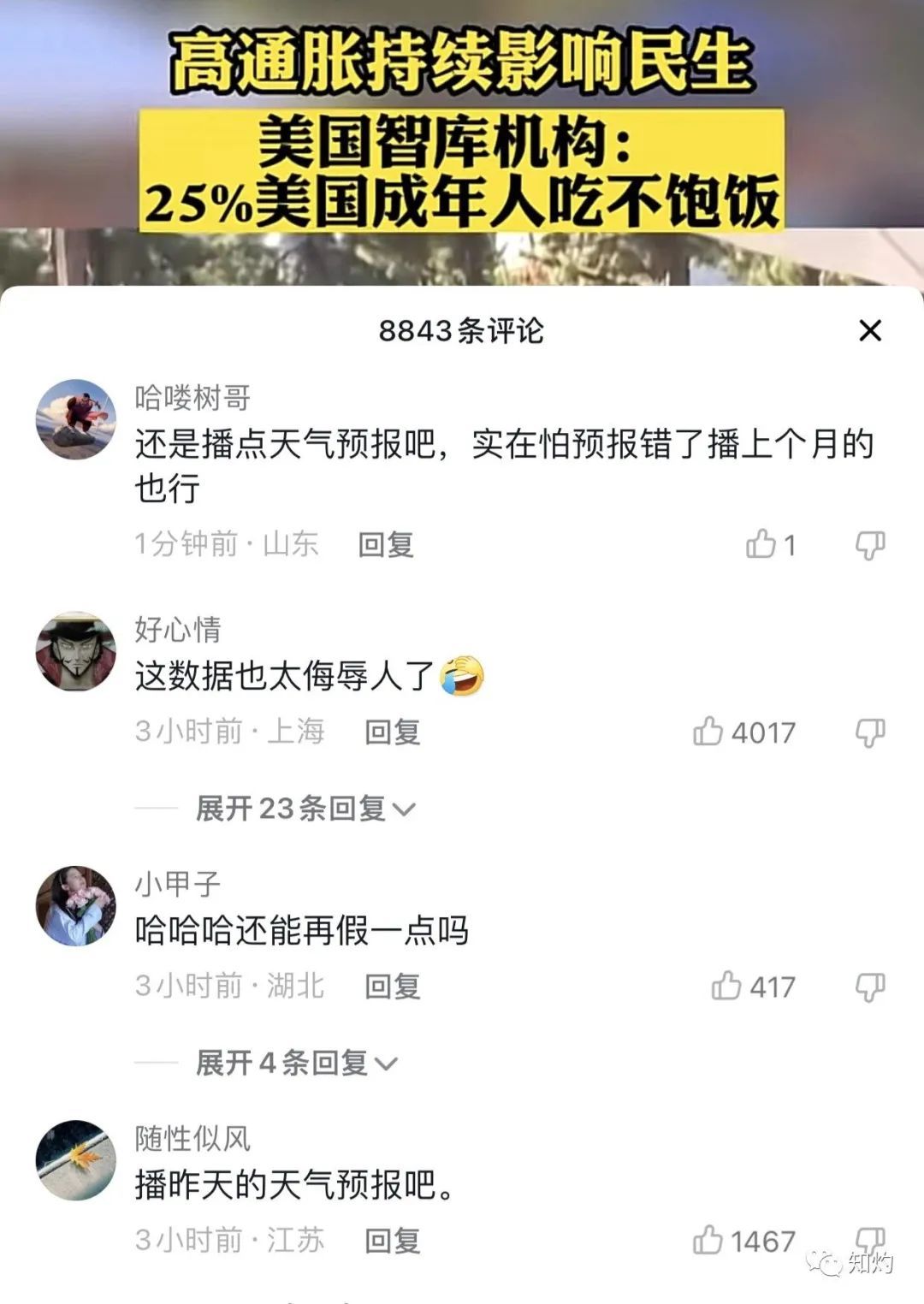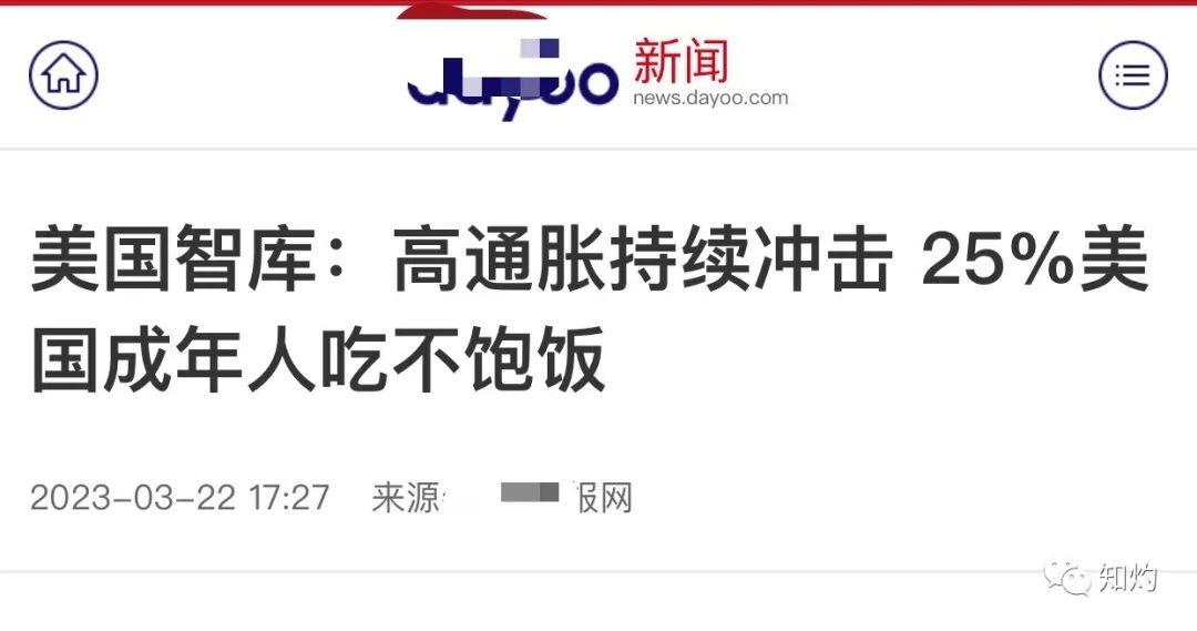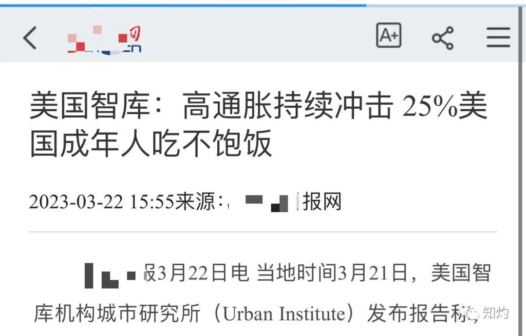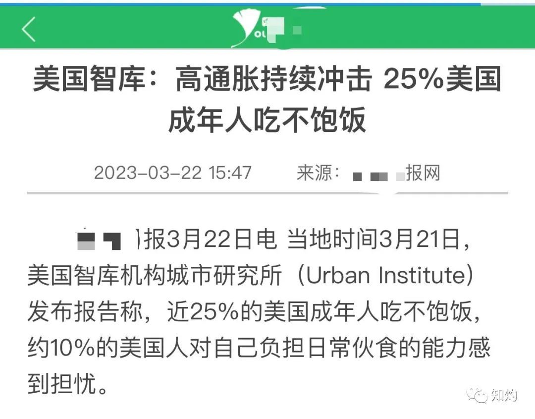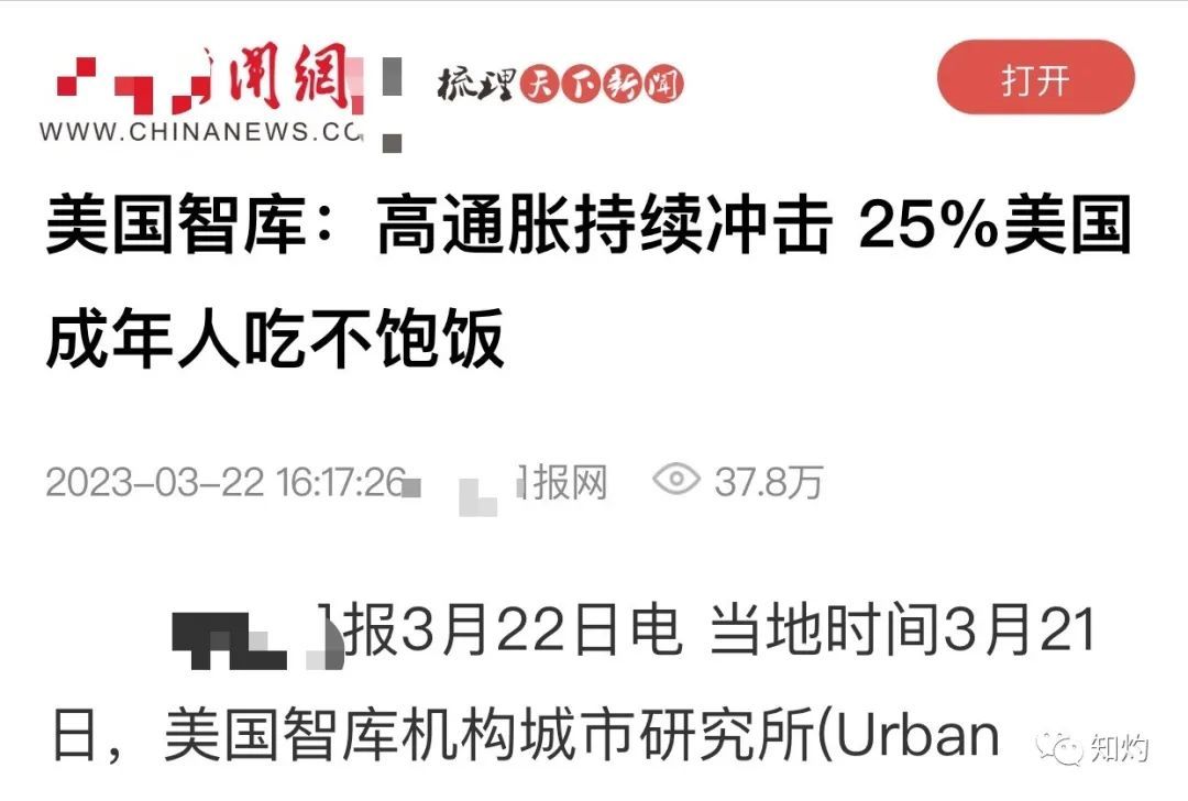标题是《高通胀持续影响民生,美国智库机构:25%美国成年人吃不饱》