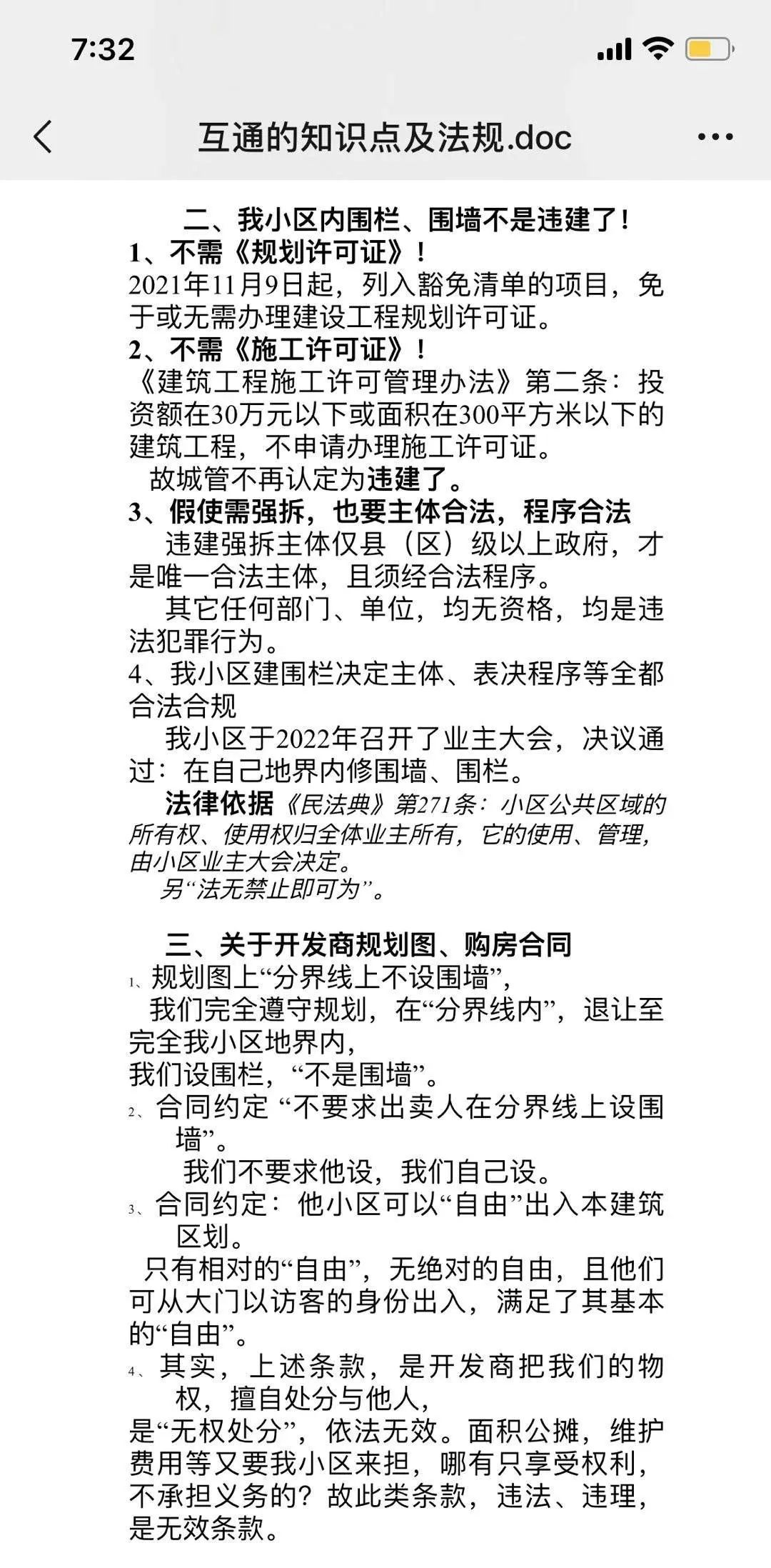 4、根据《民法典》第271条(小区公共区域的所有权、使用权归全体业主所有,它的使用、管理由小区业主大会决定),小区内设围栏围墙已得到2022年业主大会决议通过,设在小区地界内(非分界线上)合法合规,且不需《规划许可证》和《施工许可证》,需拆除也要程序合法。同时华侨城购房合同称“小区内公共区域无任何阻挡”,但不是与其他小区无任何阻拦。