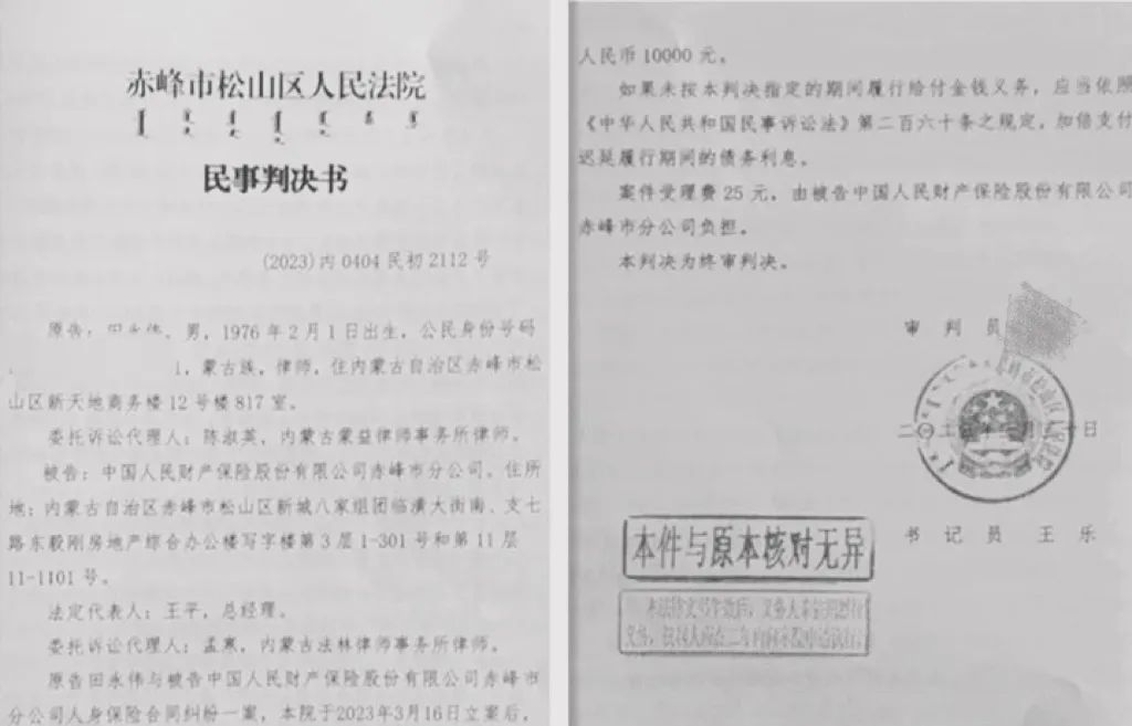 田永伟:下来了。3月30日赤峰市松山区人民法院下发了判决书,原文是”判决中国人民财产保险股份有限公司赤峰市分公司于本判决生效之日起三十日内,给付原告田永伟法定传染病确诊保险金人民币10000元”。还有诉讼费25元,也由被告支付。