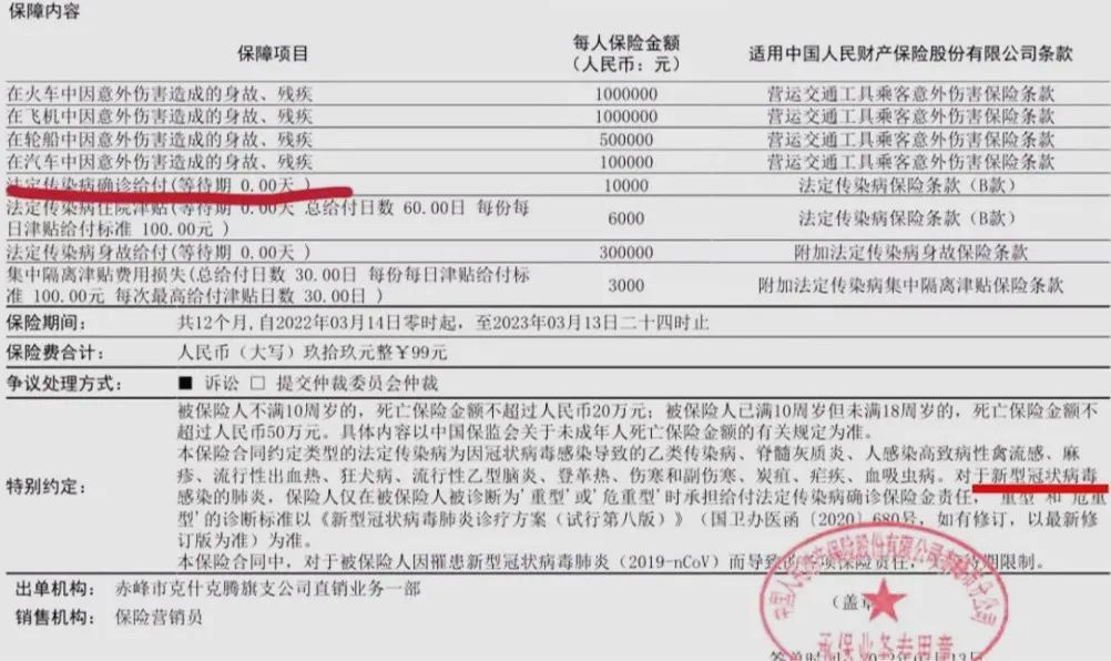 田永伟:这个保单名称为“约定法定传染病保险”,简称“安疫行”升级版。上面明确写了保期12个月,自2022年03月14日至2023年03月13日 。法定传染病确诊给付10000元。“新冠”就属于法定传染病。保单中的特别约定上还写着:“本保险合同中,对于被保险人因罹患新型冠状病毒肺炎(2019-nCoV)而导致的各项保险责任,无等待期限制”。
