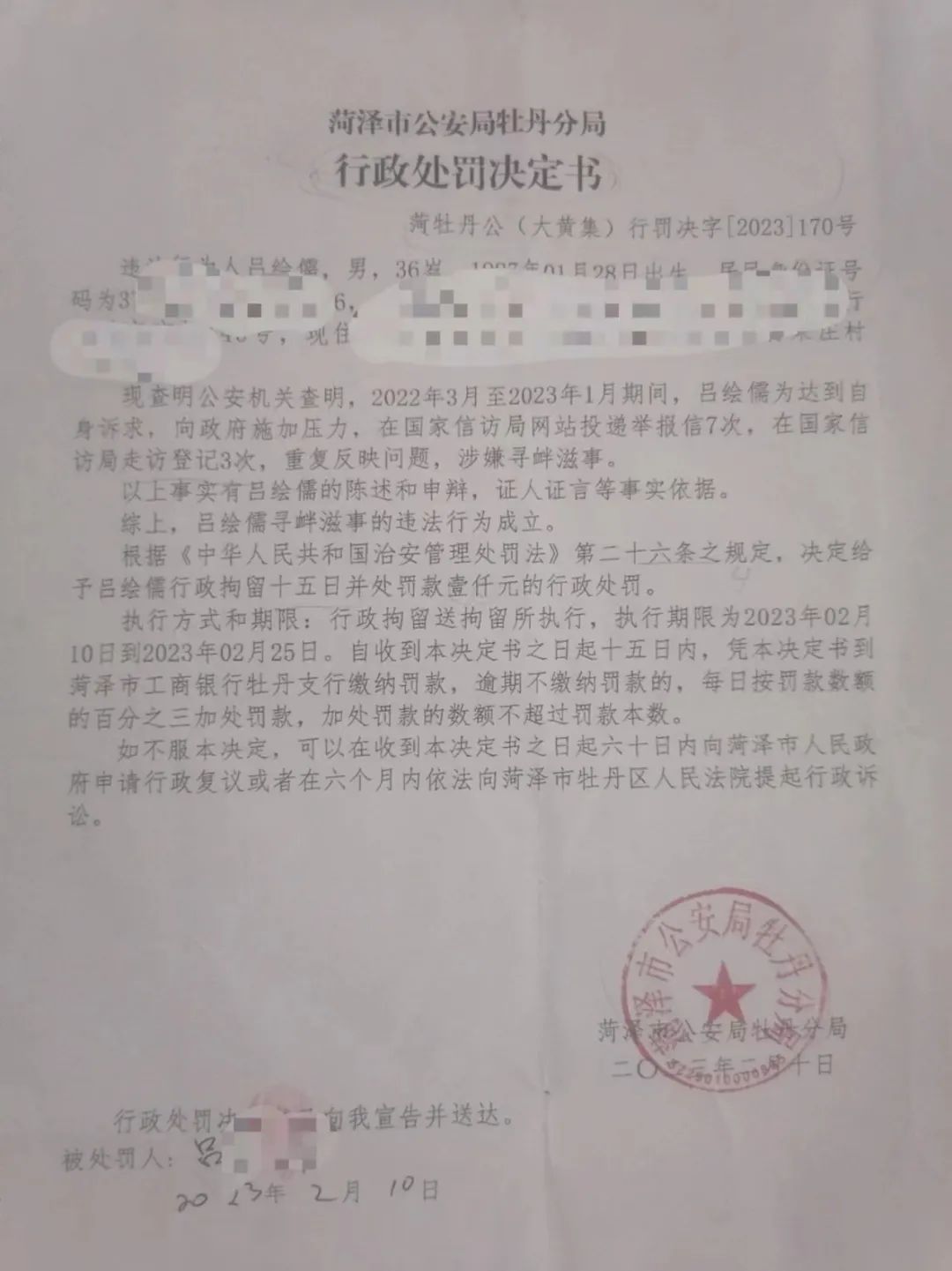 吕绘儒(经确认系本人)提供的菏泽市公安局牡丹分局《行政处罚决定书》显示,公安机关查明,2022年3月至2023年1月期间,吕绘儒为达到自身诉求,向政府施加压力,在国家信访局网站投递举报信7次,在国家信访局走访登记3次,重复反映问题,涉嫌寻衅滋事。