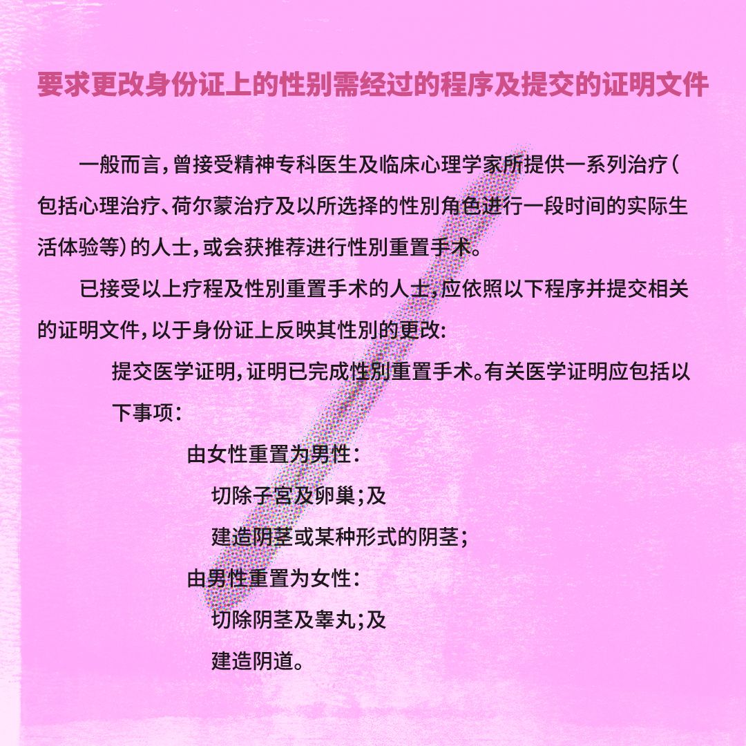 国际特赦组织2019年一份报告指出,中国跨性别人士除面对严格的性别转换手续外,也因缺乏信息,令TA们被逼以高风险、无管制的渠道进行性别肯定医疗程序。