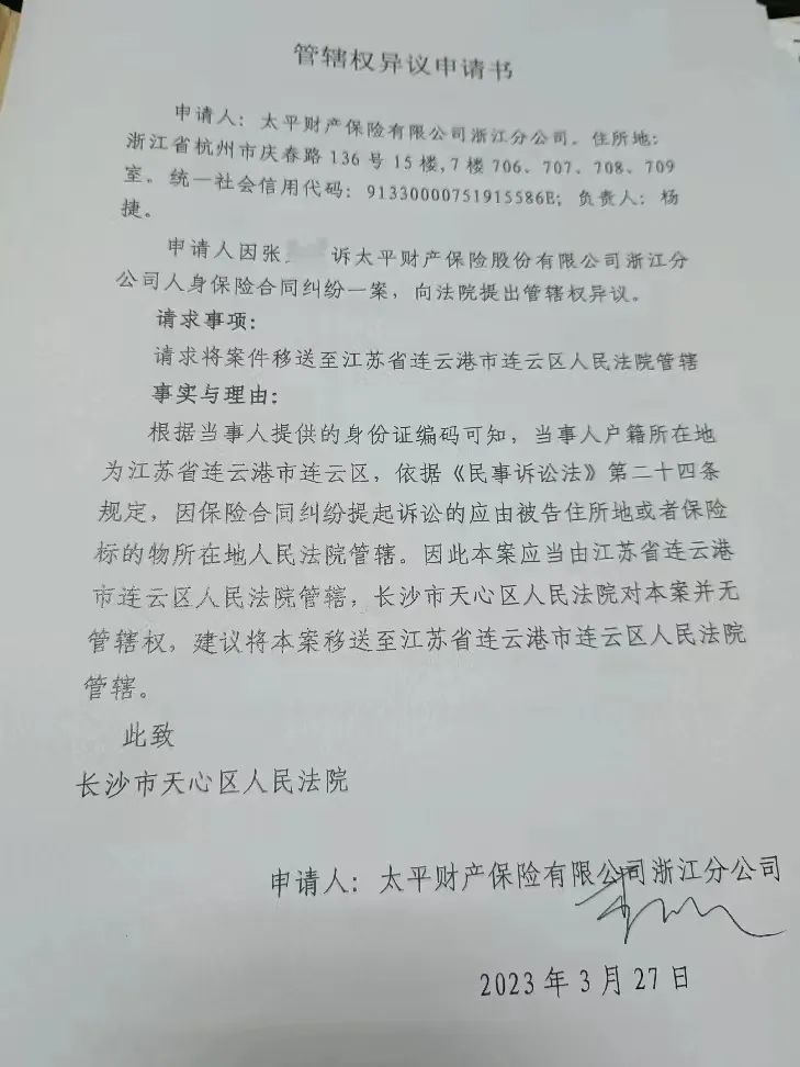 太平保险浙江分公司“根据当事人提供的身份证编码”,推断出张先生的户籍所在地为“江苏省连云港市”,并以此为由,向长沙市天心区法院递交《管辖权异议申请书》,认为长沙市天心区法院对本案没有管辖权。