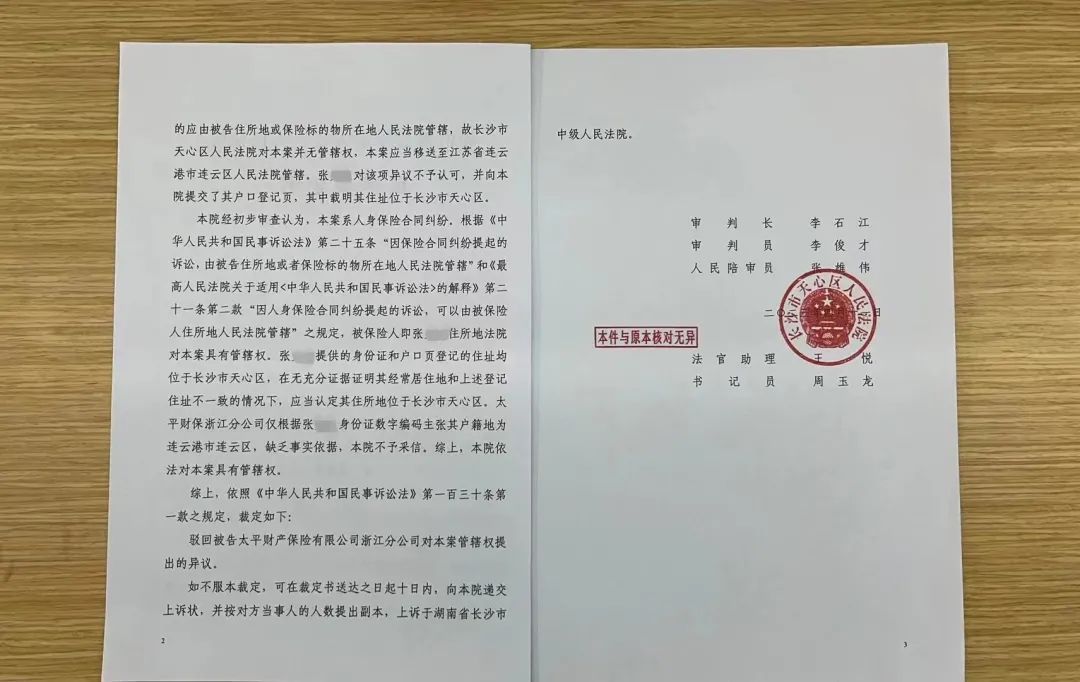 2023年4月11日,长沙市天心区法院作出民事裁定,驳回了太平保险浙江分公司提出的管辖权异议。