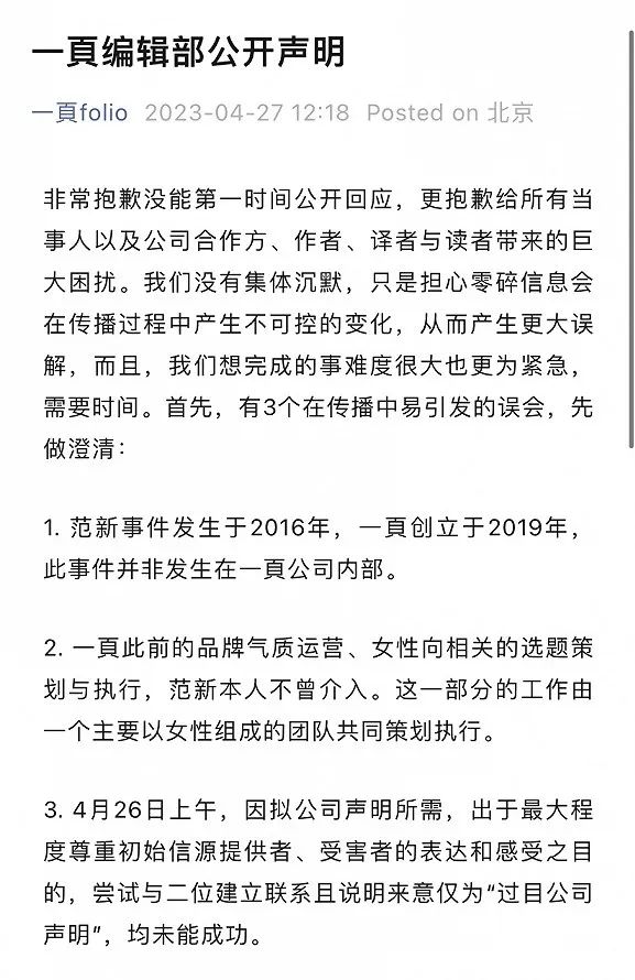 同日,一頁在公开声明中称,以一頁品牌的名义向读者告别,品牌总监恰恰也在个人微博上发布了对当年事件的回忆细节。目前关于此次事件的讨论仍在进行中,界面文化采访了当事人恰恰、范新、涂涂,以及乐府文化与一頁folio的编辑员工二二和泛子,还有其他出版公司的女性从业者小蕃与蘑菇,同时试图联系事件中涉及的女员工,但未能成功。
