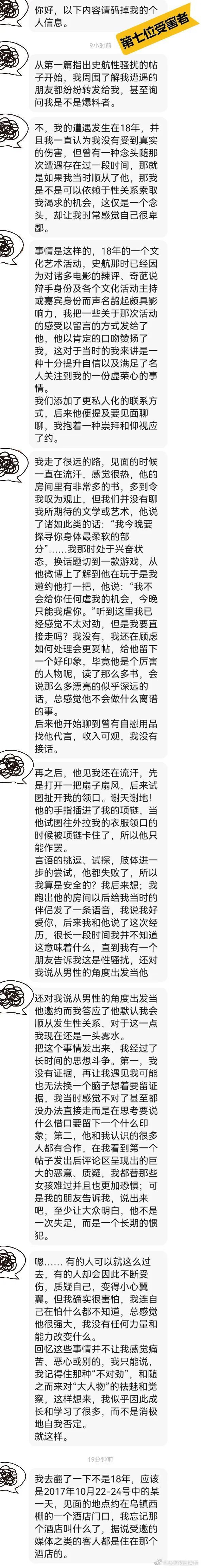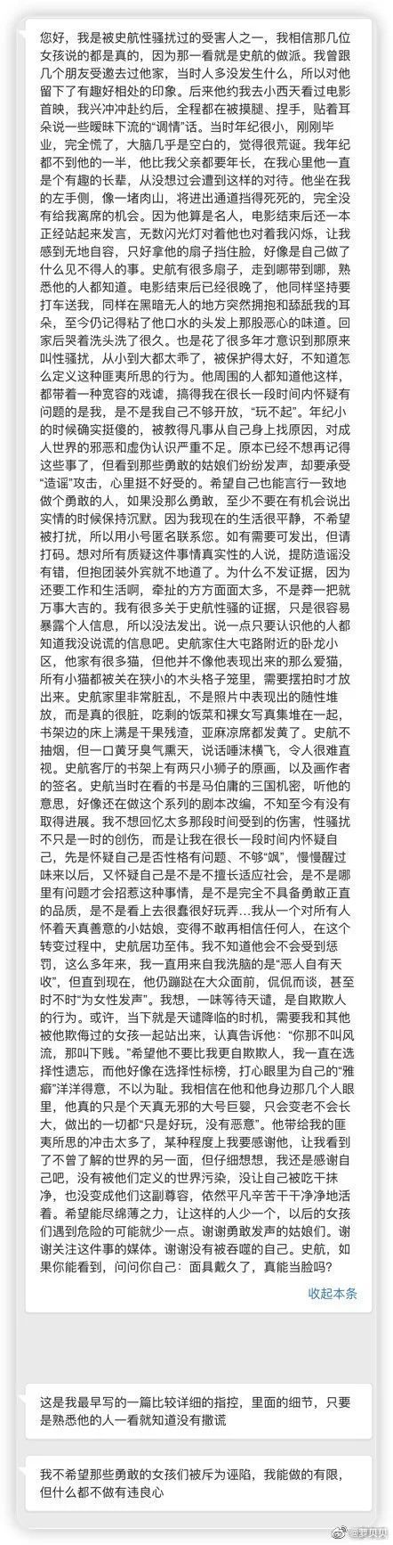 这篇投稿发出后,迅速在微博上传播,并于28日晚冲上了微博热搜。此后,又有多名受害者以匿名或实名的方式站出来,控诉史航用相似的方式对其进行性骚扰。