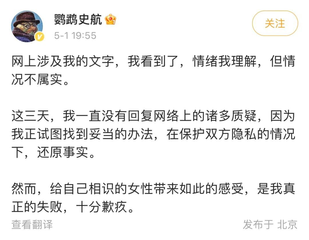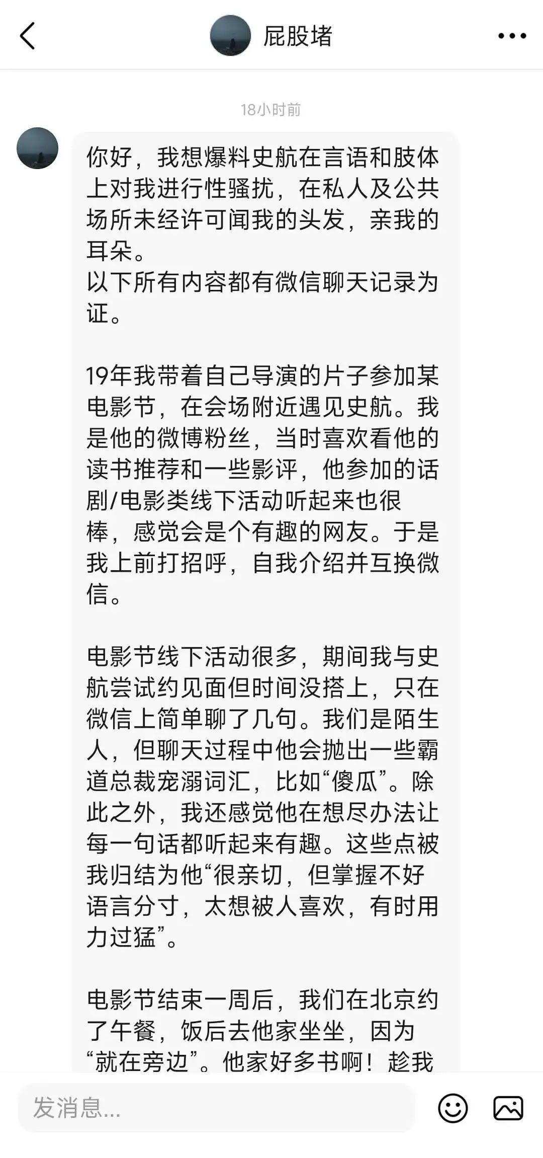 2018年,受害者遭到史航的性骚扰,并努力发声。微博用户“在于关系”在2023年4月29日凌晨帮这位受害者发帖。