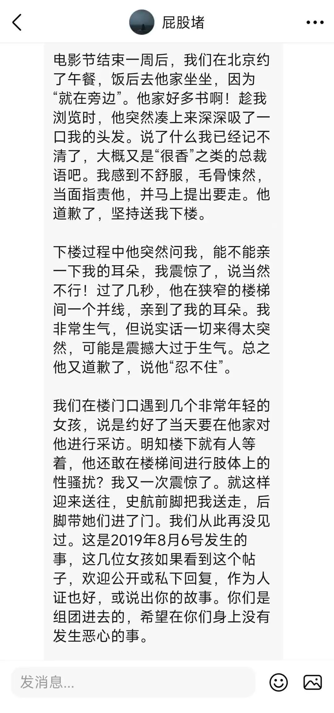 编剧祝明在4月29日收到受害者的关于史航十几年前性骚扰经历的投稿。