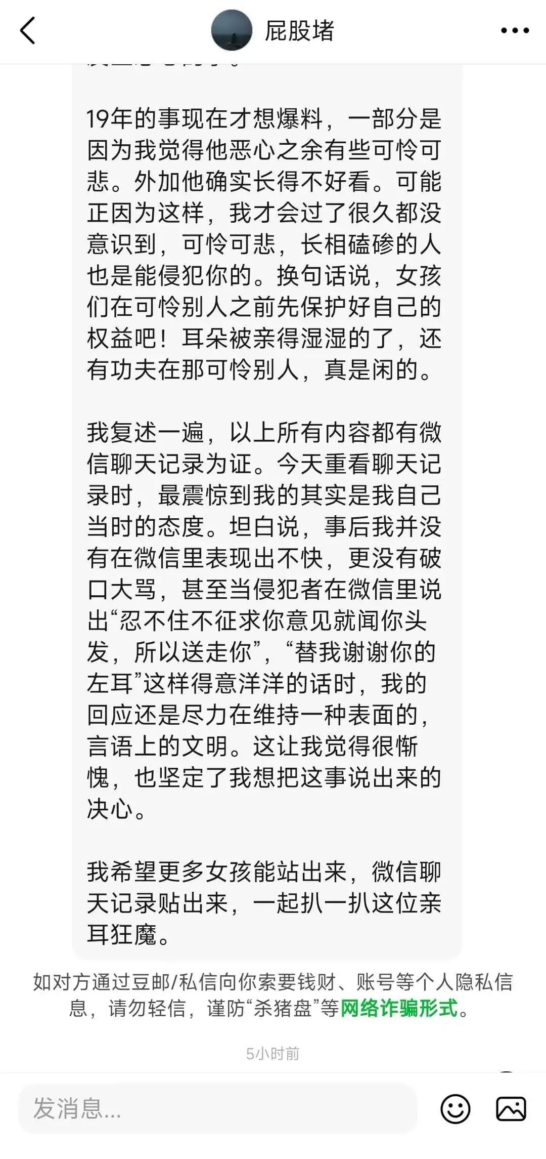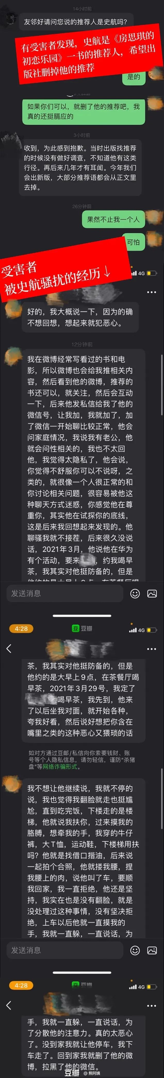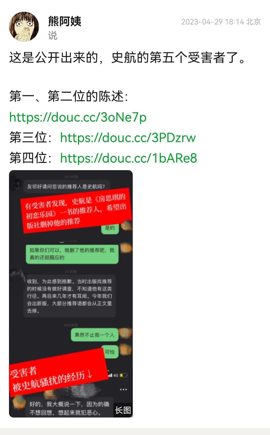 豆瓣用户“熊阿姨”在4月29日发布了史航性骚扰事件受害者的投稿。
