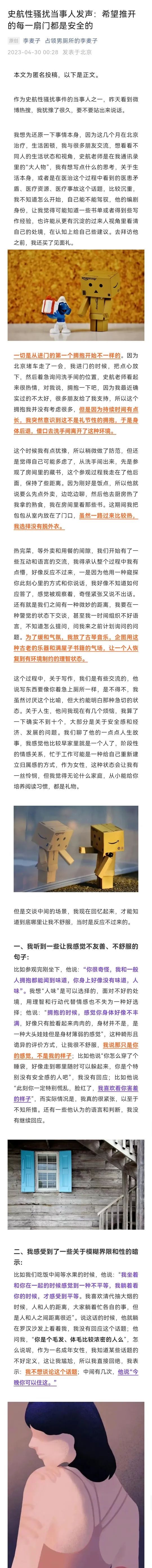 公众号“占领男厕所的李麦子”在4月30日凌晨发布了一篇史航性骚扰受害者的投稿。