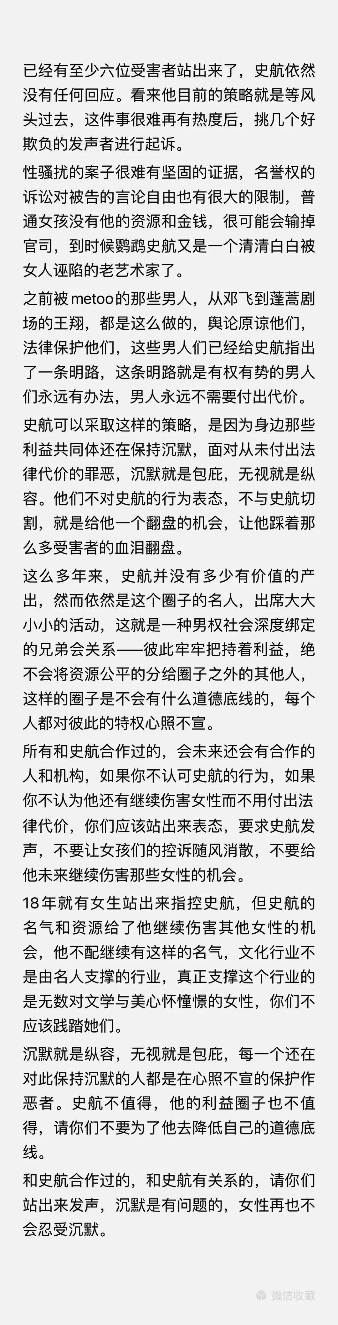 其整理汇总了史航利益相关方信息,呼吁网友联系史航的合作者或相关方,希望他们明确反性骚扰的态度、终止与史航的合作,以及要求史航做出回应。