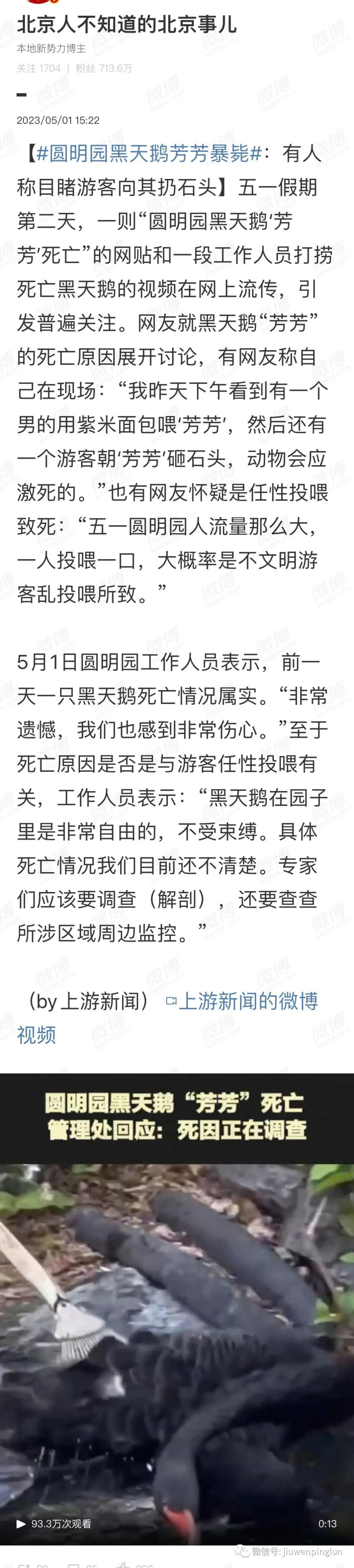 印象最深的是,圆明园死了一只黑天鹅,大概率是被游客砸死。还有,上饶一处湿地公园的孔雀,疑似躲避顽童拔羽毛飞到轨道上被碾毙。这是动物界在今年五一前后遭遇的惨重损失,足见高级动物无论老小,对进化链下游的动物构成致命威胁。