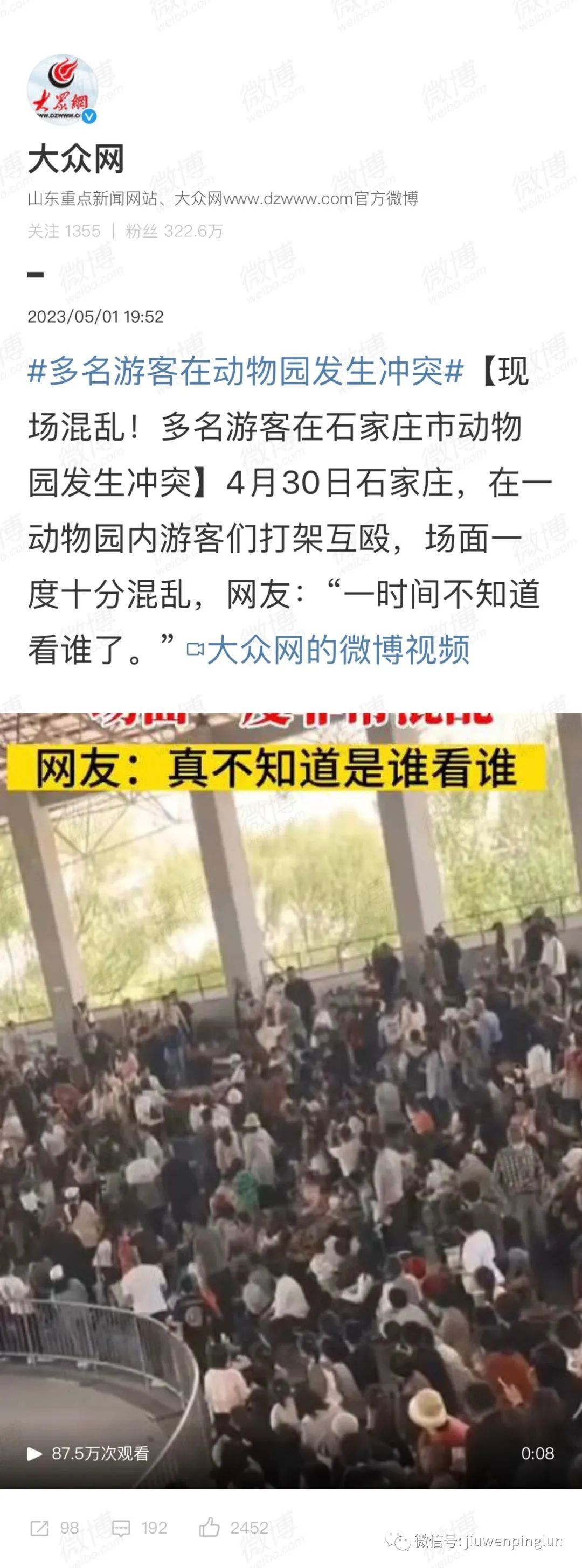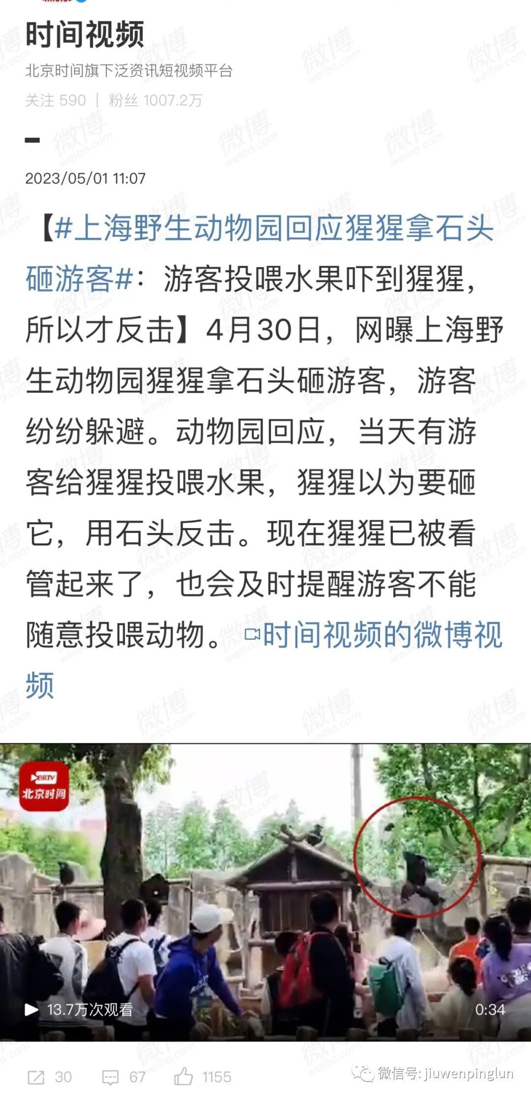 猩猩起义的既视感。同是动物,是否只有猩猩在牢笼中?视大猩猩为观赏动物,可曾想大猩猩视人类为何物?看视频过程,没别的,就是好笑,却也不能一笑了之那种的好笑。动物园是今年五一假期“冲突”的高发地带,陷入刻板行为中的动物和高级动物……