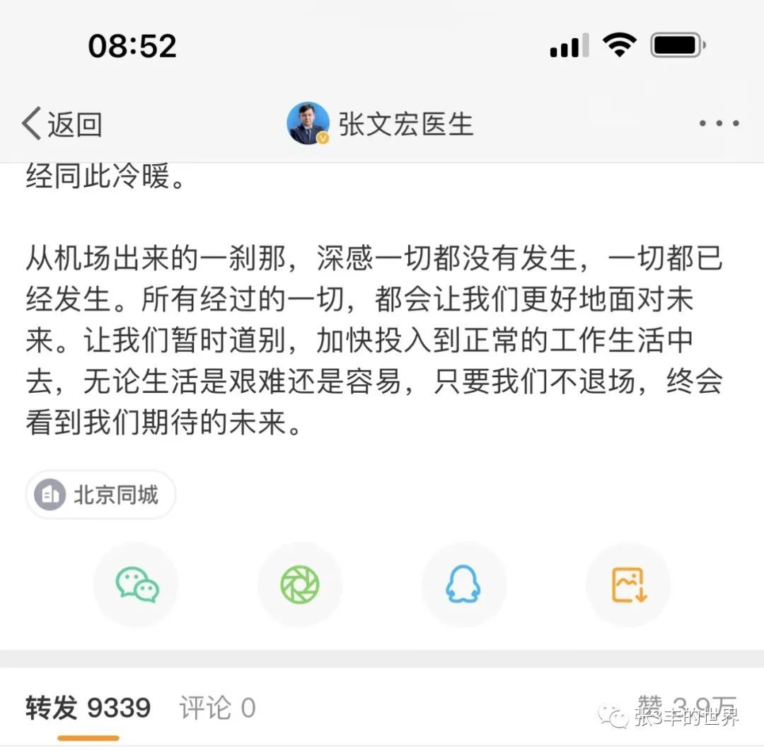 世卫组织昨晚宣布新冠不再构成“国际关注的突发公共卫生事件”,昨晚11点多,所乘坐的飞机刚刚降落到首都机场,张文宏医生就发了一条微博,表达了他的心情。