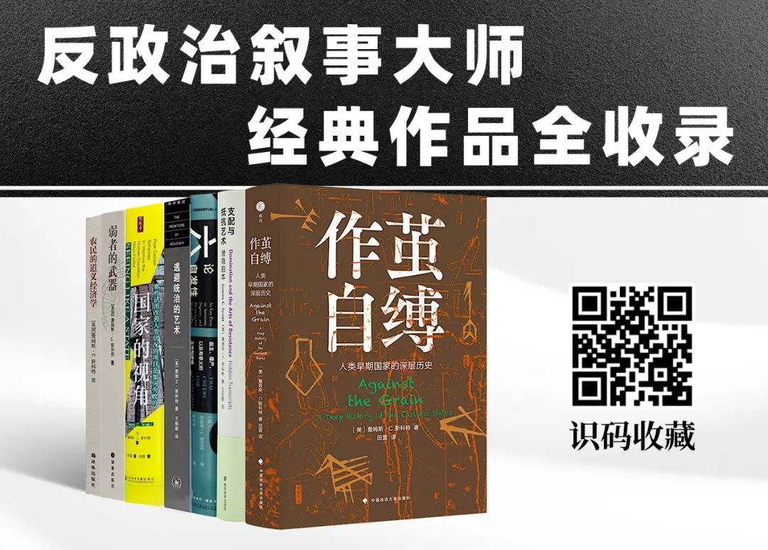 先知书店完整收录斯科特的《国家的视角:那些试图改善人类状况的项目是如何失败的》《六论自发性:自主、尊严以及有意义的工作和游戏》(主标题不修改难以出版)《弱者的武器》(副标题被消失)《逃避统治的艺术》《抵抗与支配艺术》等反政治叙事的经典作品,更包括最新出版的,老爷子81岁宝刀不老的集大成之作《作茧自缚》。长按下图,识别图中的二维码,即可一键收藏。