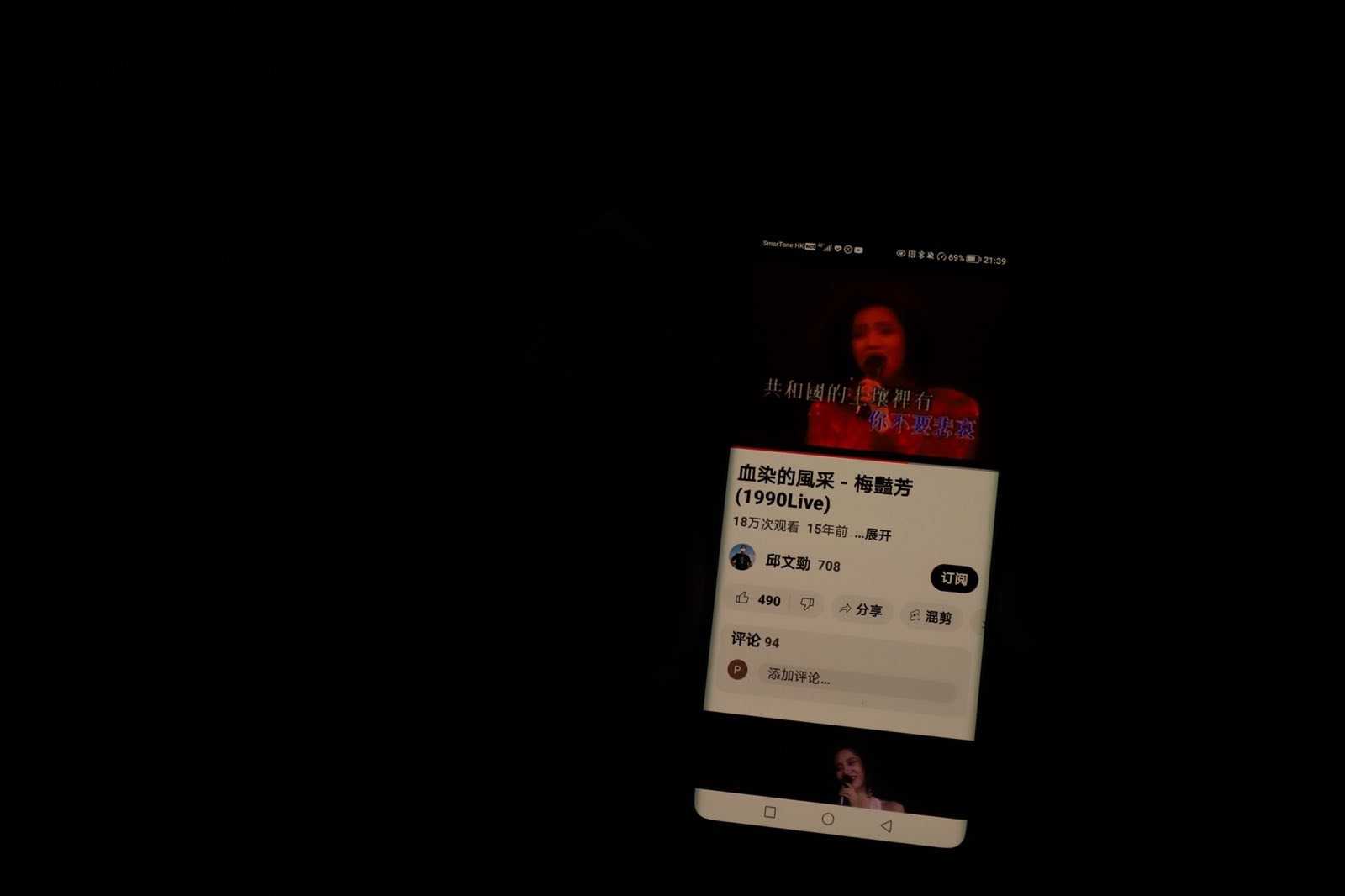 老人用手机循环播放梅艳芳演唱的《血染的风采》