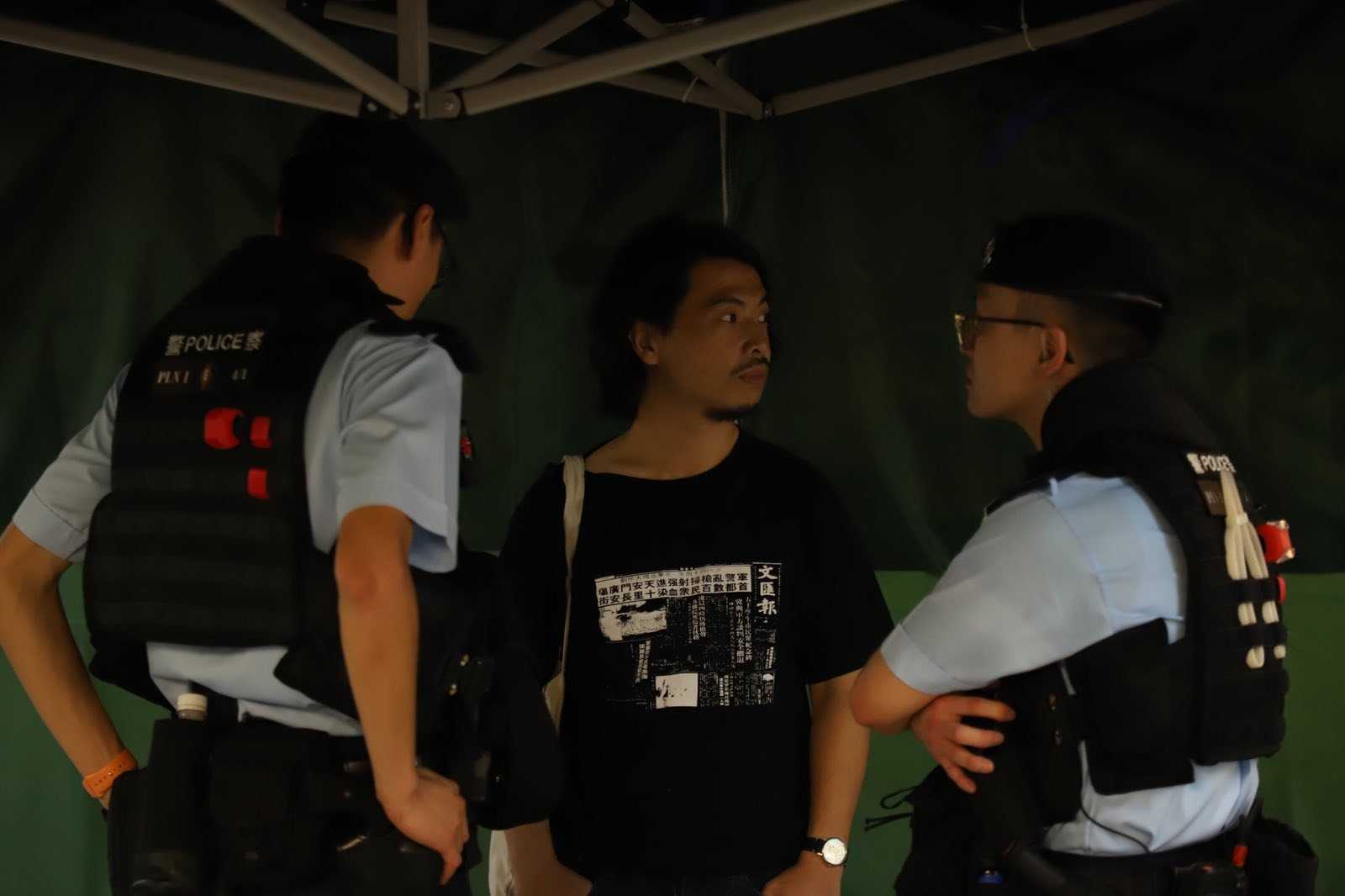 工会组织职工盟副主席邓建华被警察截查,他身穿印有亲北京媒体《文汇报》1989年报道和谴责天安门镇压的黑色短袖