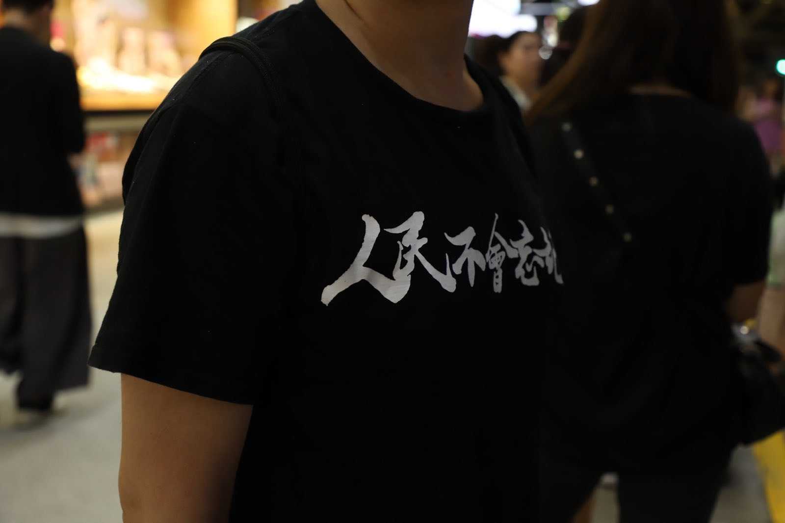 阮先生身穿印有“人民不会忘记”的黑色短袖