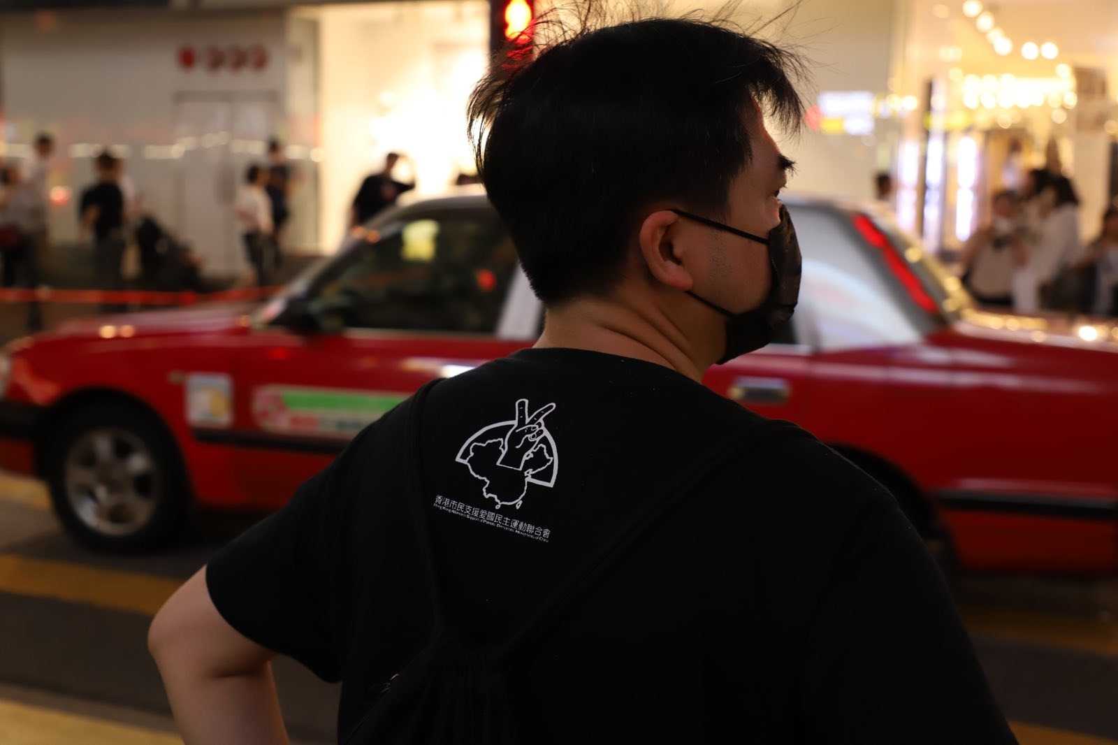 阮先生的短袖背后印有支联会标志