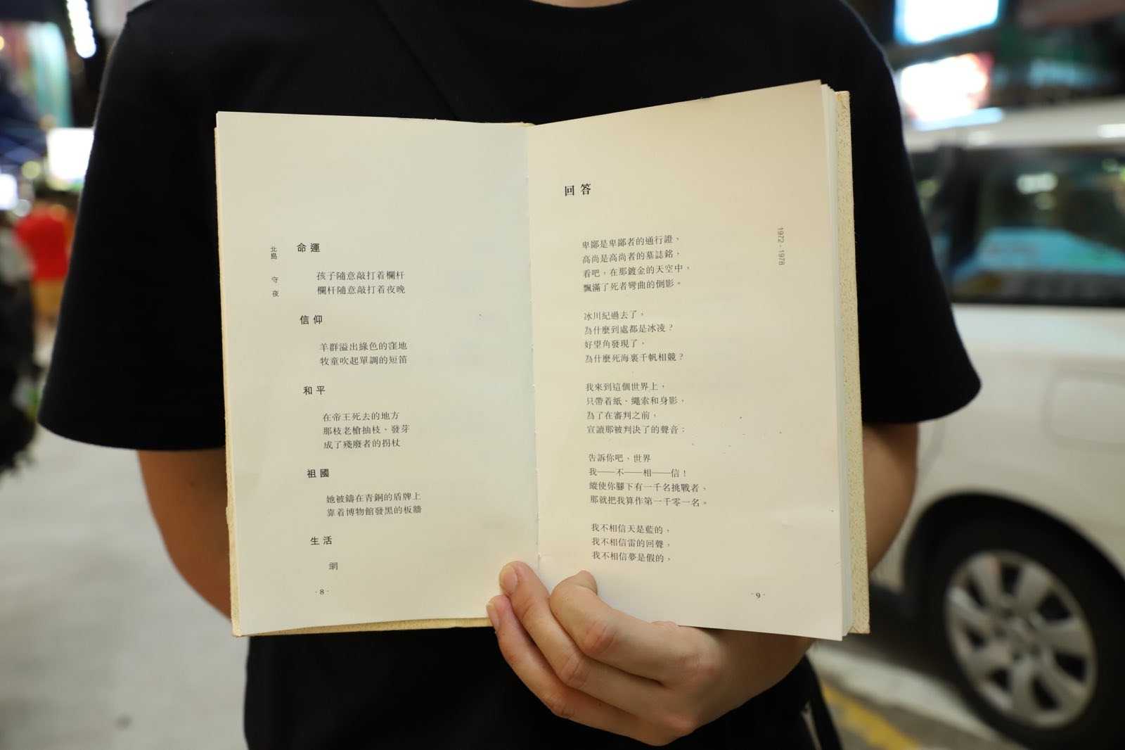 年轻一代的身影也没有缺席。22岁的Samuel和21岁的Angus是大学同学,两人举着一本北岛诗集,展开《回答》的那一页,向铜锣湾熙熙攘攘的内地游客讲解六四事件和香港人每年的纪念。