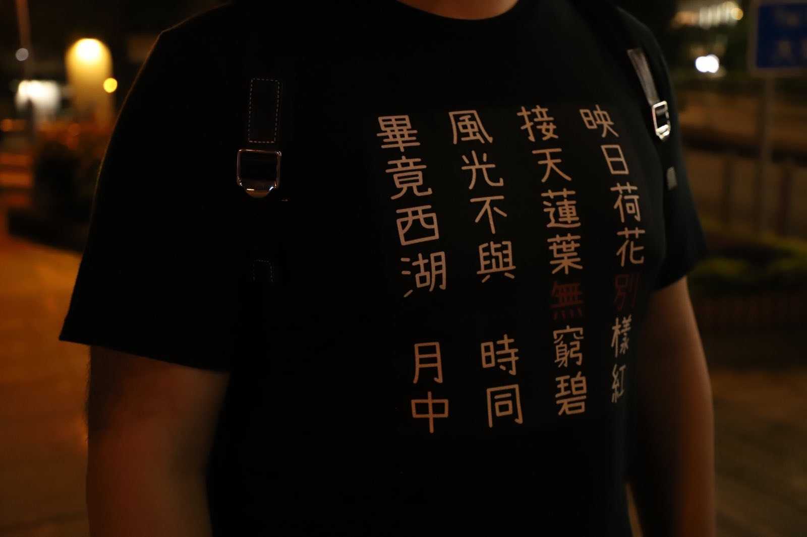他穿着一件黑色短袖,上面印着《晓出净慈寺送林子方》,“毕竟西湖六月中,风光不与四时同。接天莲叶无穷碧,印日荷花别样红。”在今日的维园门前,这首宋诗有了别样的意味:“六”和“四”被抹去,“无”和“别”被描红。