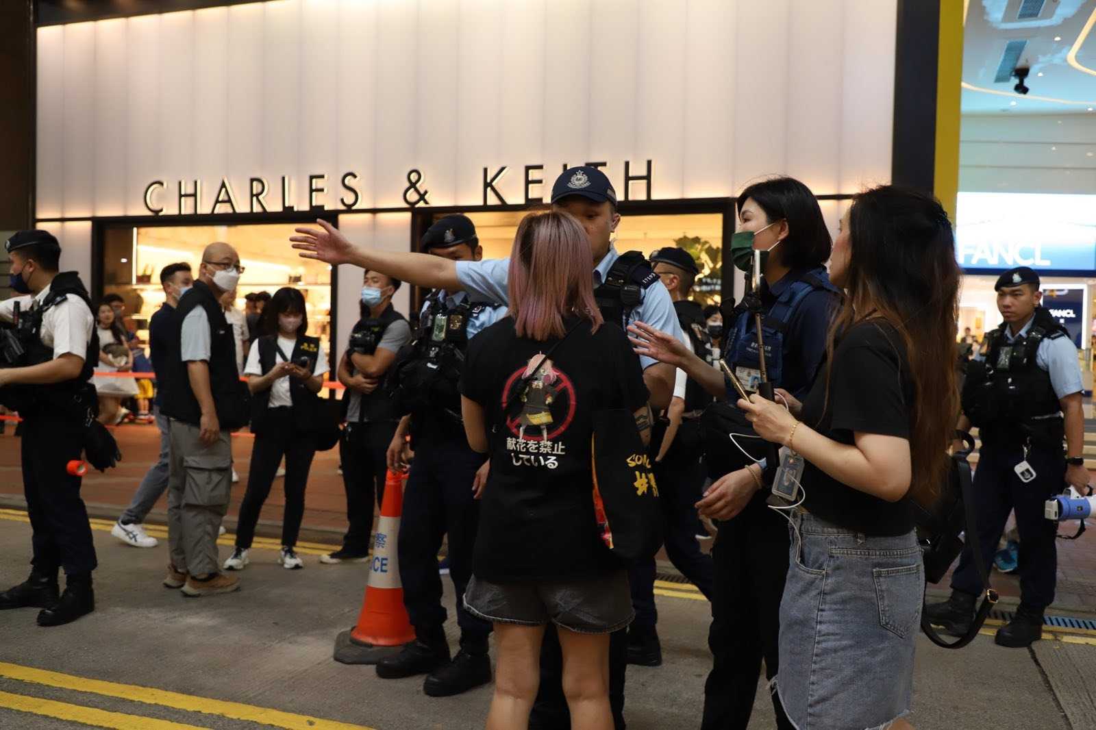 一名网媒记者因衣服带有“献花”、“禁止”等标语被警察截查