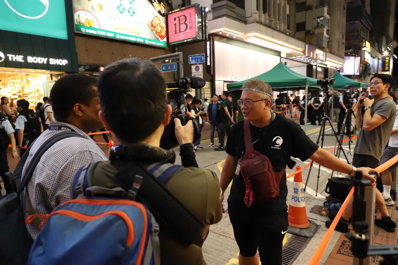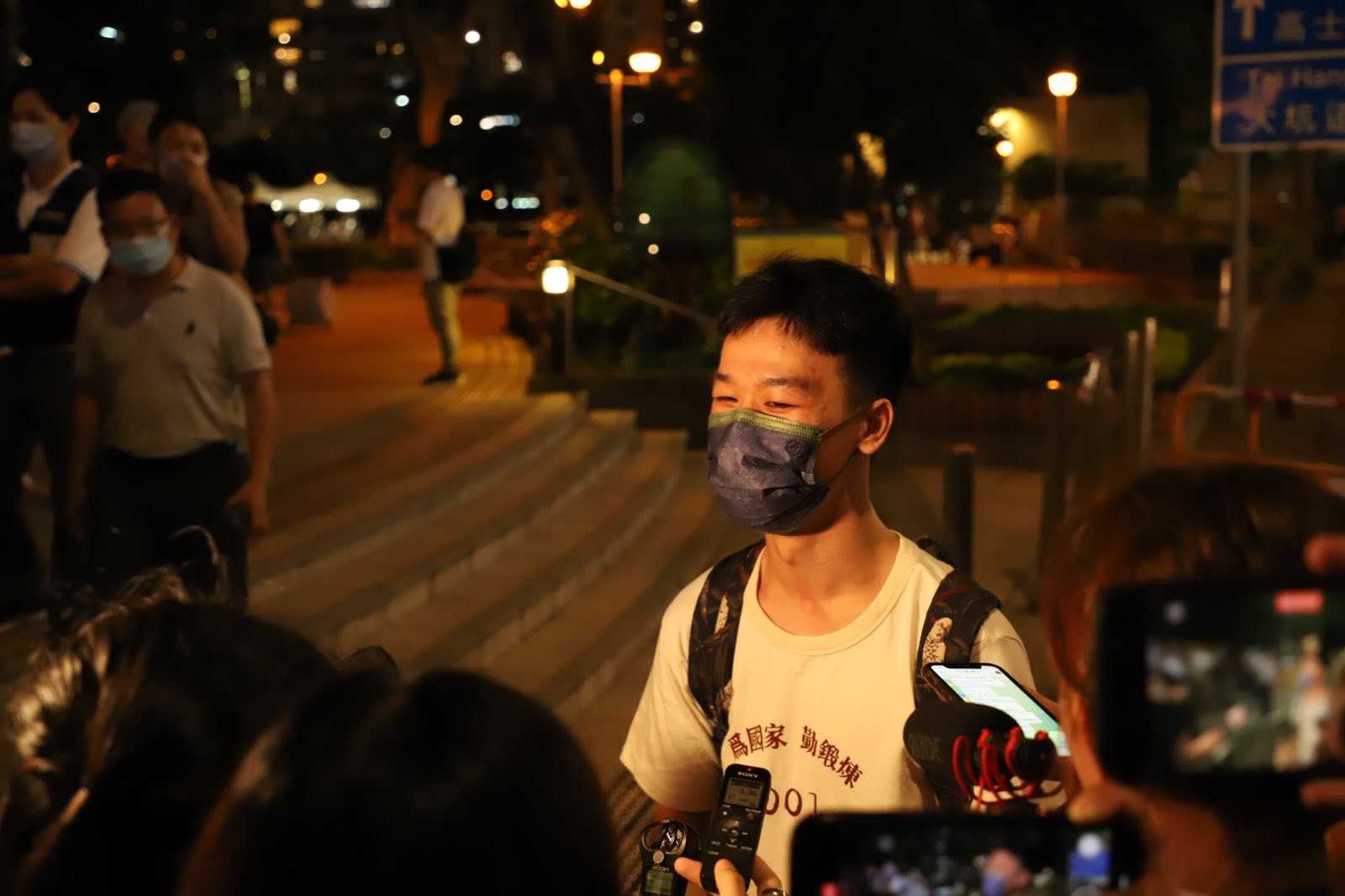 身穿“为国家、勤锻炼”影射六四集会的年轻人被警察截查后,被媒体围住采访