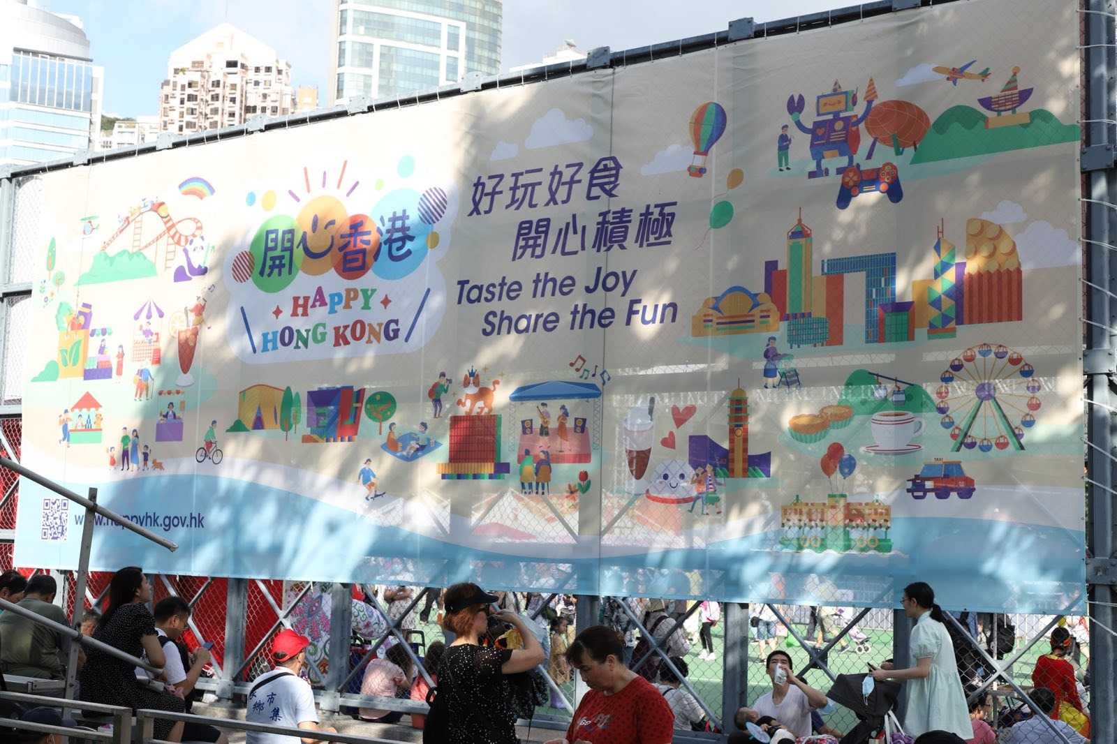 维园内写有政府标语“开心香港”的巨幅宣传牌