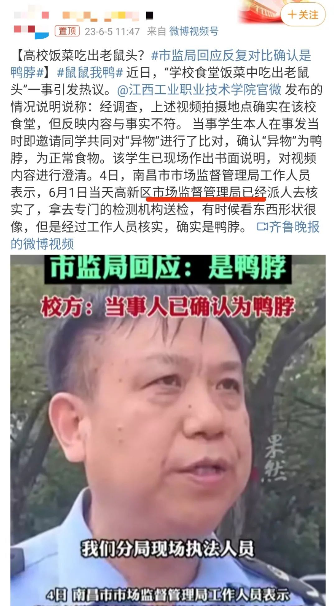 江西工业职业技术学院学生在饭里吃出耗子的事已经过去了好几天,这几天来官方一没有发布进一步声明,二也隐隐有些装死冷处理的意思,如今指鹿为马的事情闹得这么大,各种对公信力冷嘲热讽的梗和无奈的调侃层出不穷,结果至今官方介入所谓“鸭脖事件”的最高单位居然是江西省教育厅,而不是什么卫生部门,说实话实在是叫人寒心——
