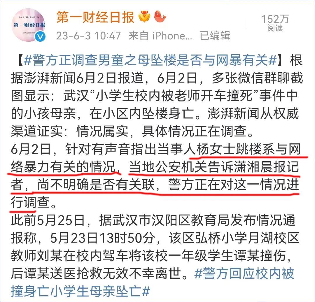 6月2日,“小学生校内被老师开车撞死”事件中的小孩母亲,在小区内坠楼身亡。关于其坠楼原因,最初有舆论认为网络暴力是杀死这位母亲的凶手,首恶分子为微博大V@鄂有正能量。