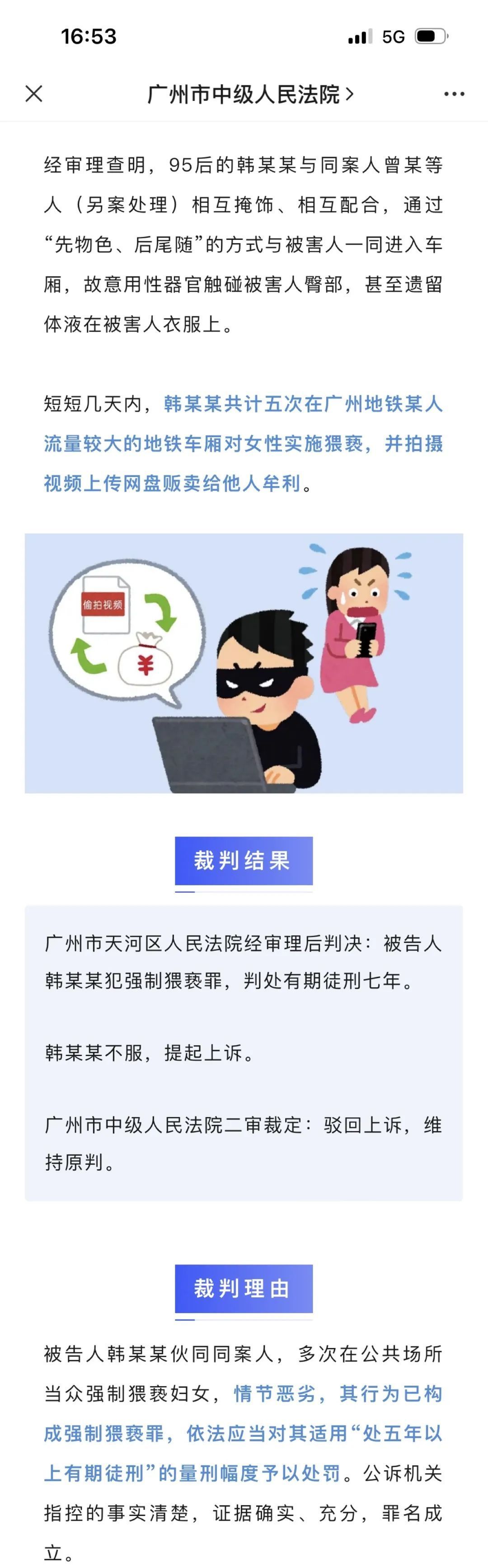 2022年3月广州市中级人民法院公开一起判例,“咸猪手”蹲点地铁猥亵女乘客,还兜售视频牟利,被判处有期徒刑七年。涉案的韩某某和曾某行为与网站偷拍猥亵视频的操作高度吻合,可能曾是“猫咪”团队的成员”。