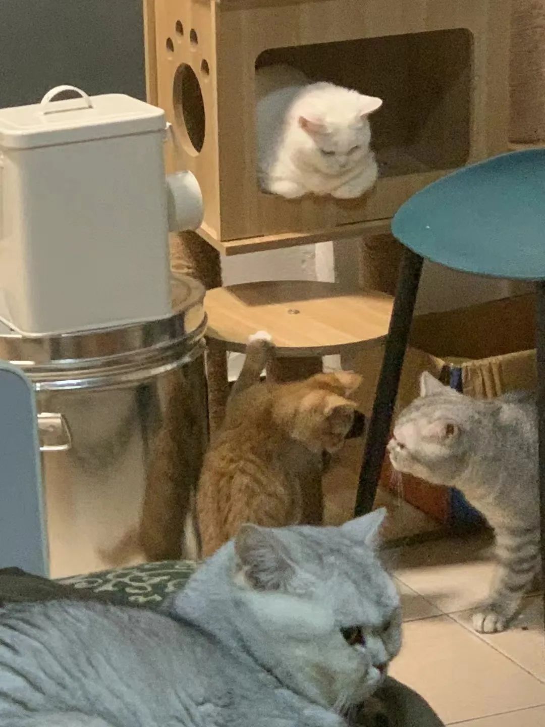 小邵家的四只猫:招财、怕怕、小白,和闪光灯。
