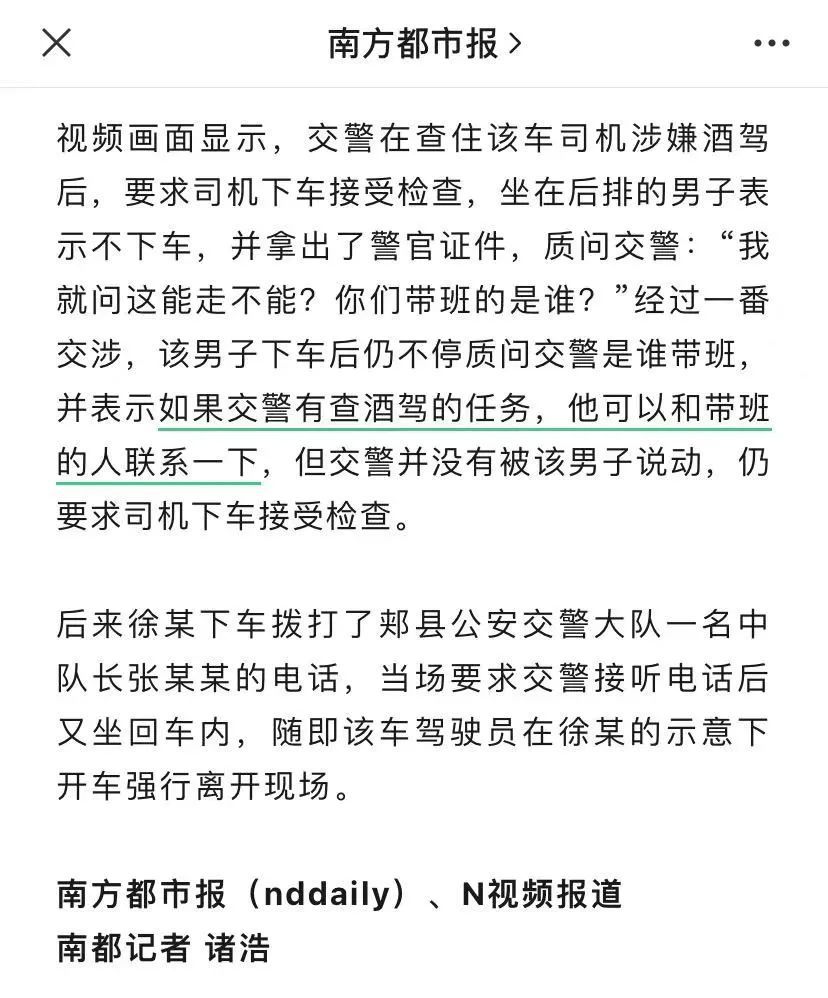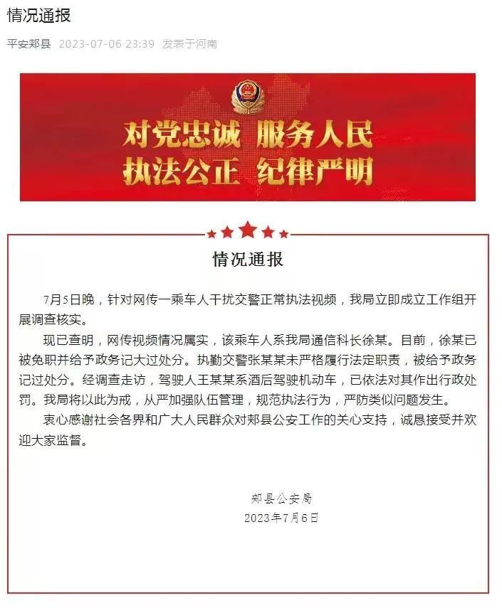 据河南省郏县公安局通报,7月5日晚,该局通信科科长、民警徐某乘坐一名酒驾司机开的车,并干扰交警(辅警)正常执法,不仅拿出警官证要求放行,还在执法记录仪前给带班交警打电话要求通融。