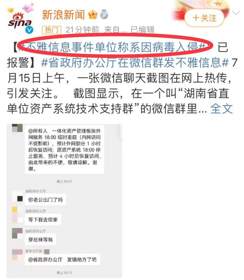 15日上午11时40分,记者联系上北京久其软件股份有限公司湖南分公司负责人徐先生,徐先生对此事回应道,“湖南省直单位资产系统技术支持群”是该公司建立的,在微信群里@ 所有人的“久其软件李某某”是公司人员,该微信群7月14日晚遭遇病毒入侵,从而导致群里出现不雅信息,自己也是15号早上才知道此事。