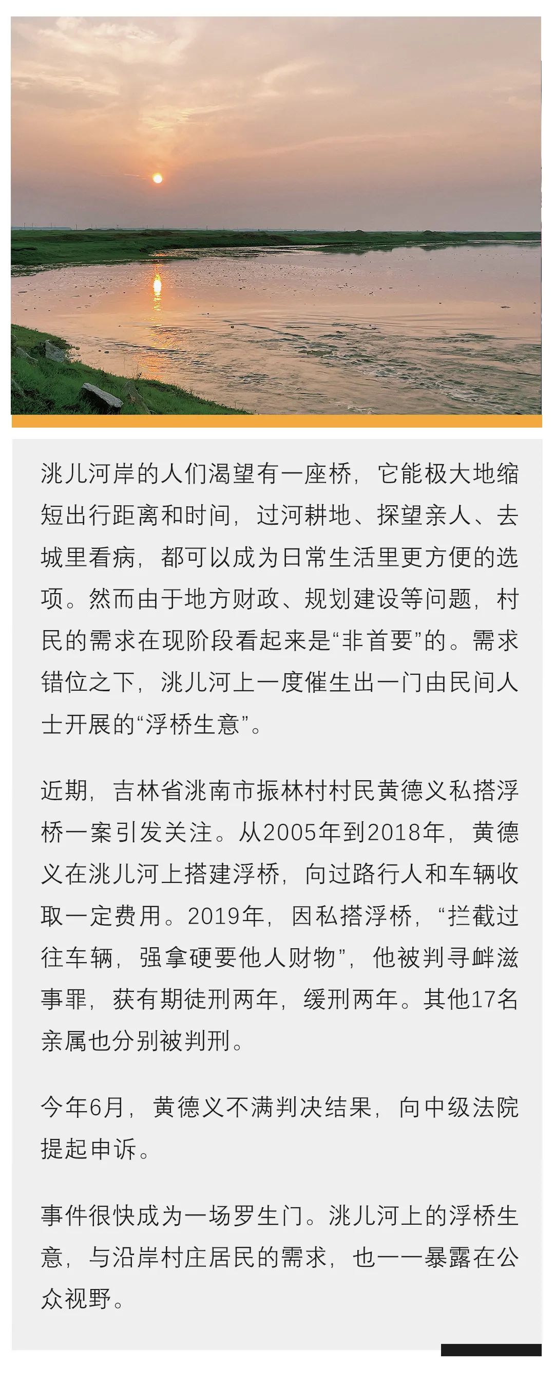 2019年2月,52岁的黄德义同样因为涉嫌犯寻衅滋事罪被拘留。12月,洮南市法院作出一审判决,认定黄德义和其他人员从2005年到2018年私搭浮桥,拦截过往车辆收费。黄德义被判处有期徒刑两年,缓刑两年。黄德义向法院提出申诉,被驳回。他的语气很愤怒,“我在河对岸有90亩耕地,我儿子天天往返不方便,我建了这桥,后来村里人都用上了。为老百姓解决实际困难,你说这事怎么能算犯罪?”