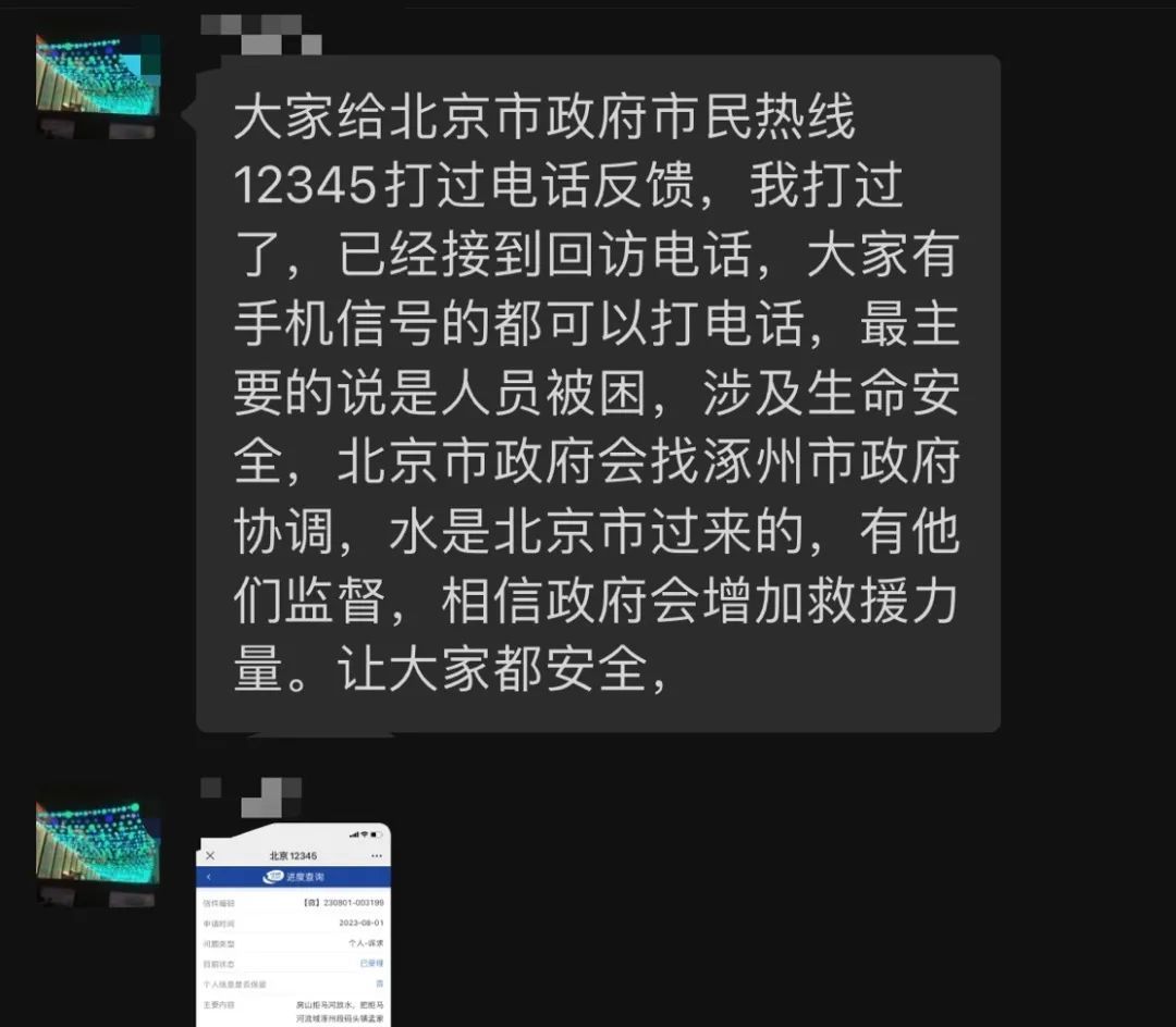 群内有人甚至想到拨打北京市长热线,反映北京的泄洪问题。