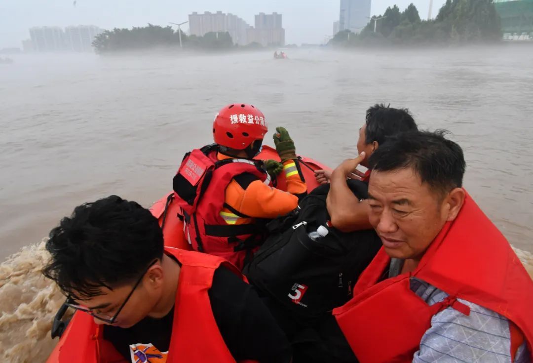 ▲2023年8月2日,河北省涿州高新技术产业开发区积水路段,救援人员正在转移受困民众 图/中新社记者翟羽佳