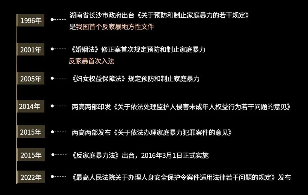 2015年,两高两部发布《关于依法办理家庭暴力犯罪案件的意见》。这是针对家庭暴力刑事犯罪非常完善、细化的规定。2015年,我们的《反家暴法》出台,并于2016年3月1号正式实施。这也是我们国家反家庭暴力法制化进程的一个里程碑事件。