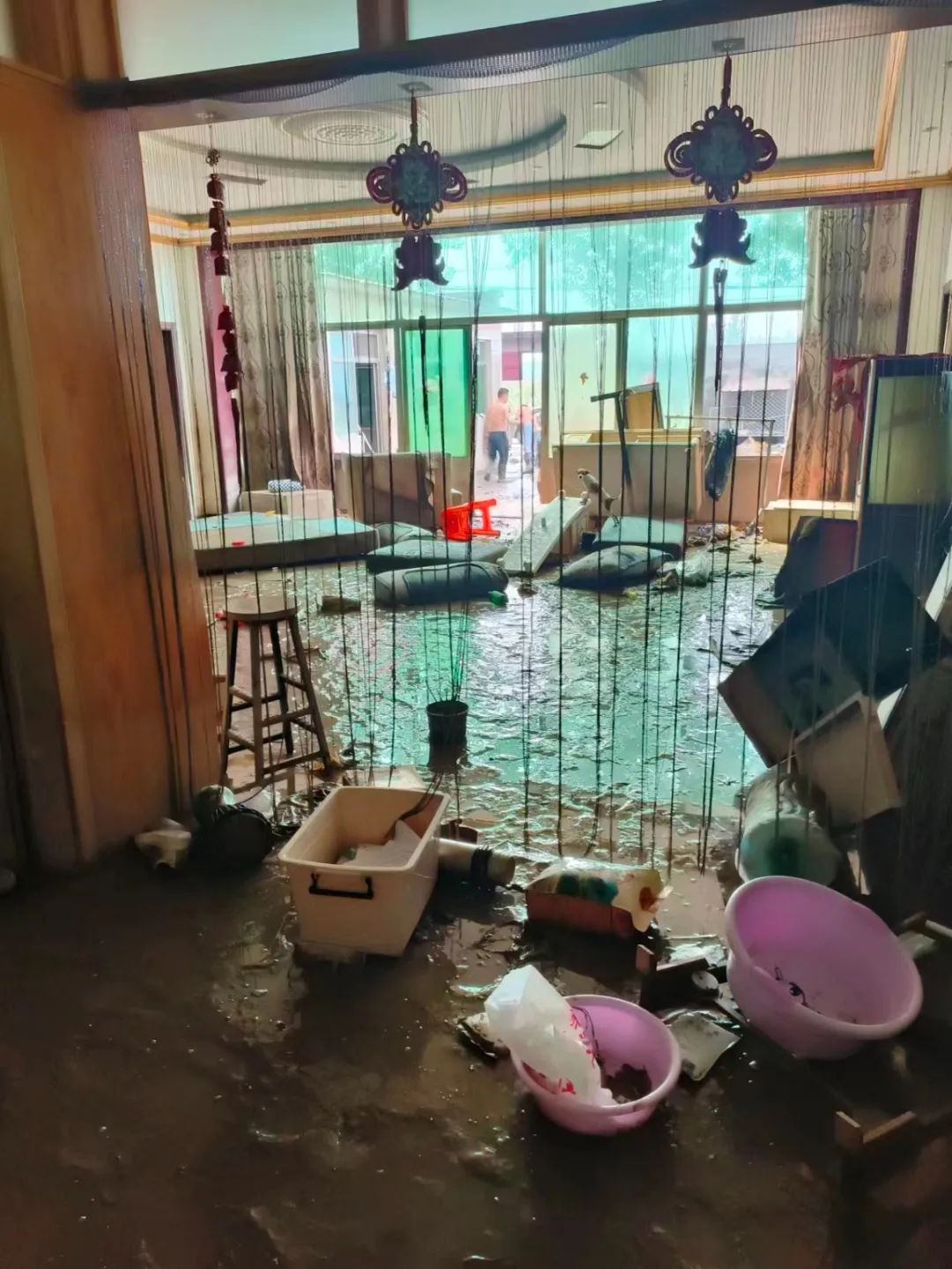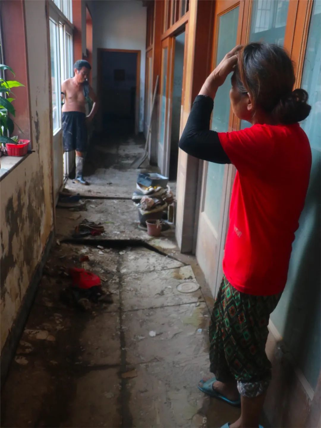 老宅子那边,家具家电、衣服、几辆电单车和摩托车都被水冲得横七竖八。正房通往厨房的过道和厕所的地板塌陷了下去,后墙出现了裂缝。李建国觉得,这房子八成要塌。