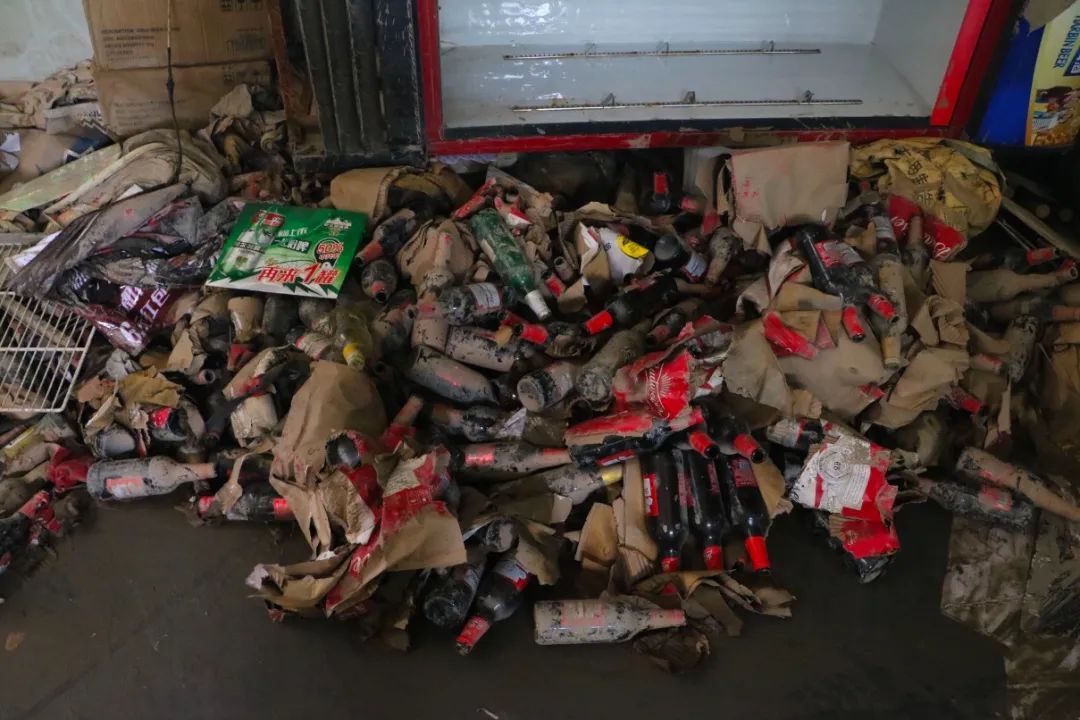 洪水一进来,啤酒倒的倒,破的破,库房里一股浓烈的酸啤酒味。张猛没算到底损伤了多少啤酒,被水泡过后,大部分不能再喝。一同被泡的,还有9辆车,7辆送货的,2辆汽车。“这下完了,这比三年疫情还严重,三年疫情(的影响)加一块也没有这次损失大。”张猛说。