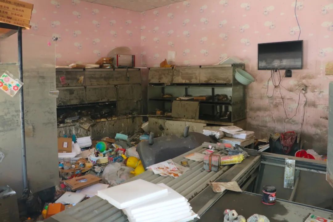洪水后,高飞夫妇甜蜜蜜蛋糕店内部一片杂乱/何国胜 摄